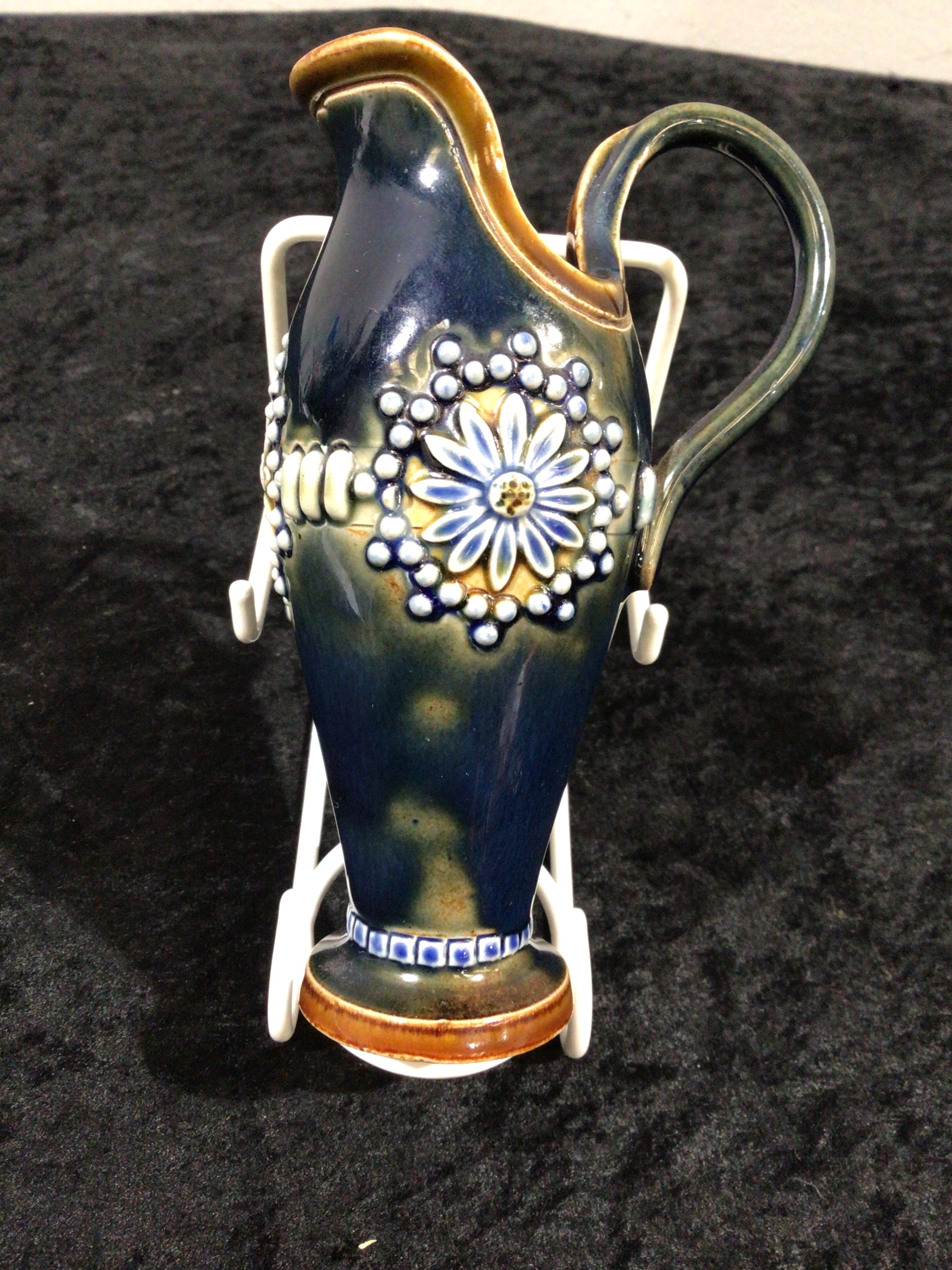 A Royal Doulton Lambeth stoneware jug, dating to the early 20th century. This small pitcher features a dark blue-green glazed body, accented with a brown/caramel colored interior lip and handle. The exterior is decorated with raised white beaded patterns and floral motifs, including a prominent blue and white flower with a yellow center. The unglazed base is impressed with “DOULTON LAMBETH ENGLAND”, the number “9393”, and additional faint marks, potentially “F.T.”, likely an artist’s monogram.