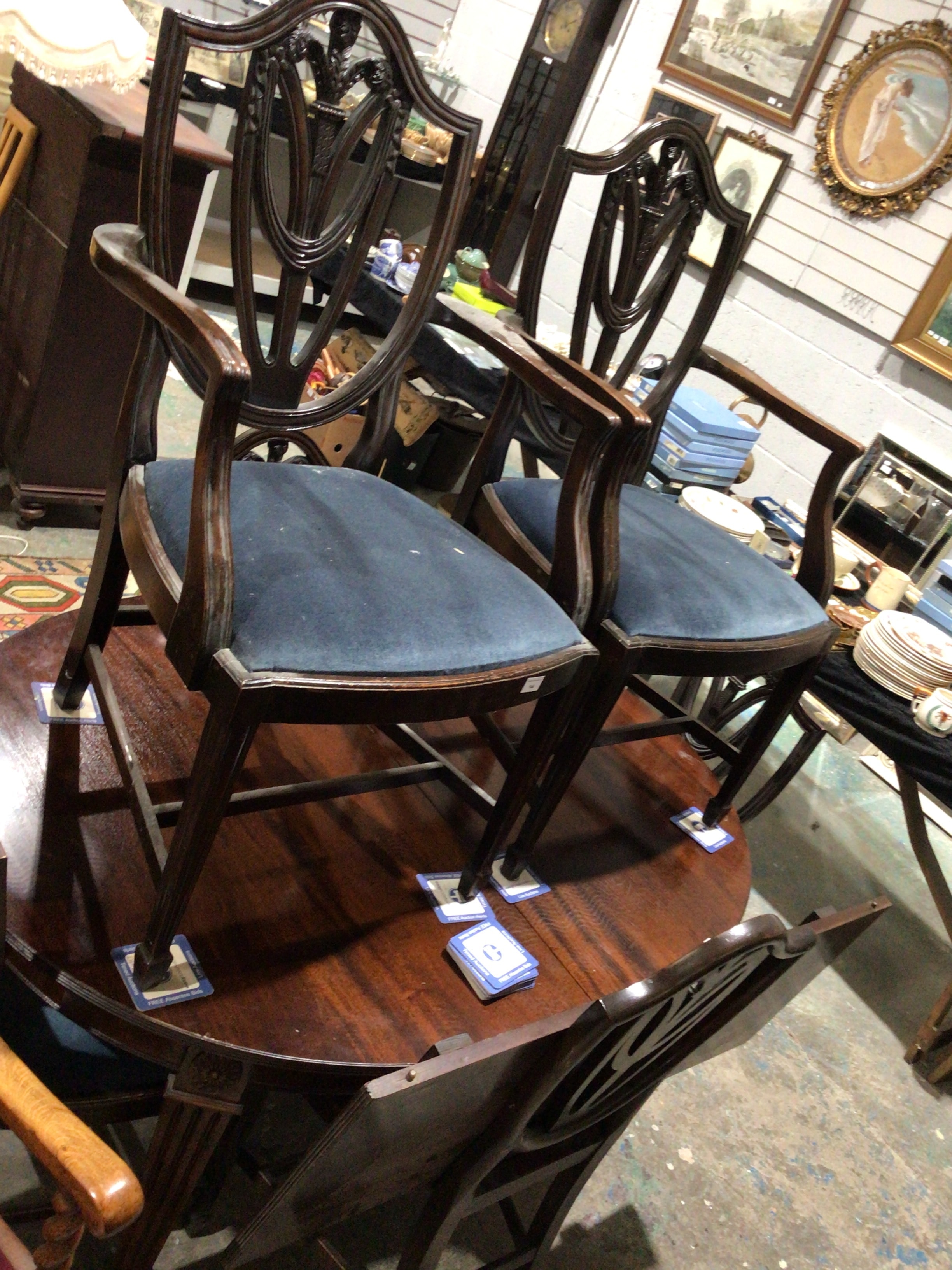 A pair of George III style dining armchairs, crafted from dark-stained hardwood, likely mahogany, in a Neoclassical manner reminiscent of Hepplewhite or Sheraton. Each armchair features a distinctive shield-shaped back adorned with carved urn and swag motifs, fluted stiles, and scrolled arms. The seats are upholstered in a plain dark blue fabric. Accompanying the chairs is a round, dark wood dining table, likely a pedestal or tilt-top style, on which the chairs are displayed.