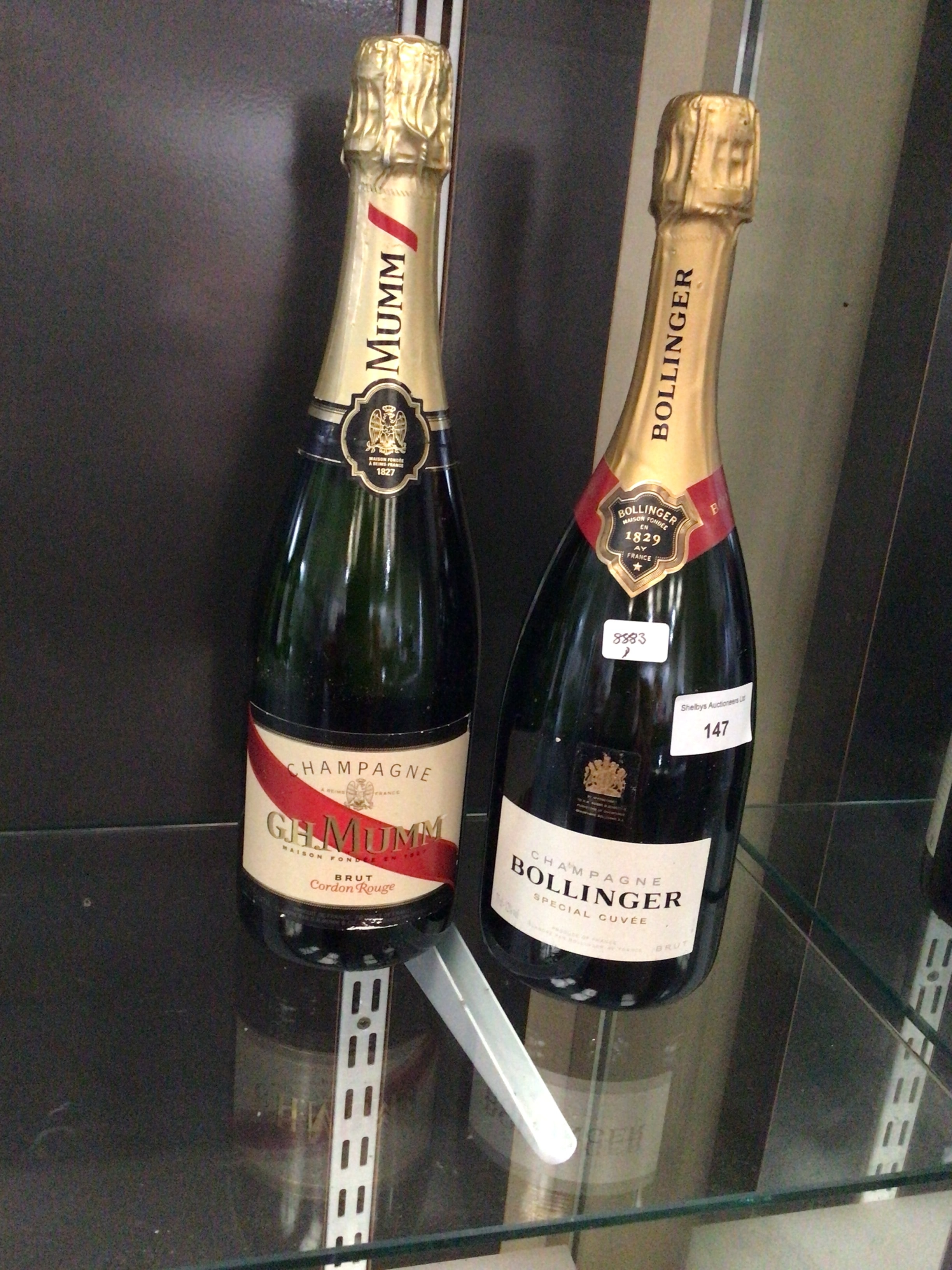 A pair of dark green glass bottles of French Brut Champagne. The bottle on the left is a GH Mumm ‘Cordon Rouge’, with ‘MUMM’ prominently displayed, and details indicating the house was ‘MAISON FONDÉE À REIMS-FRANCE 1827’. The bottle on the right is a Bollinger ‘Special Cuvée’, clearly labeled ‘BOLLINGER’ and noting its origin as ‘MAISON FONDÉE EN AŸ FRANCE 1829’. The Bollinger bottle also carries two auction stickers: one from ‘Shelbys Auctioneers Ltd’ with lot number ‘147’, and another with ‘3993’. The bottles are presented on a glass display shelf.