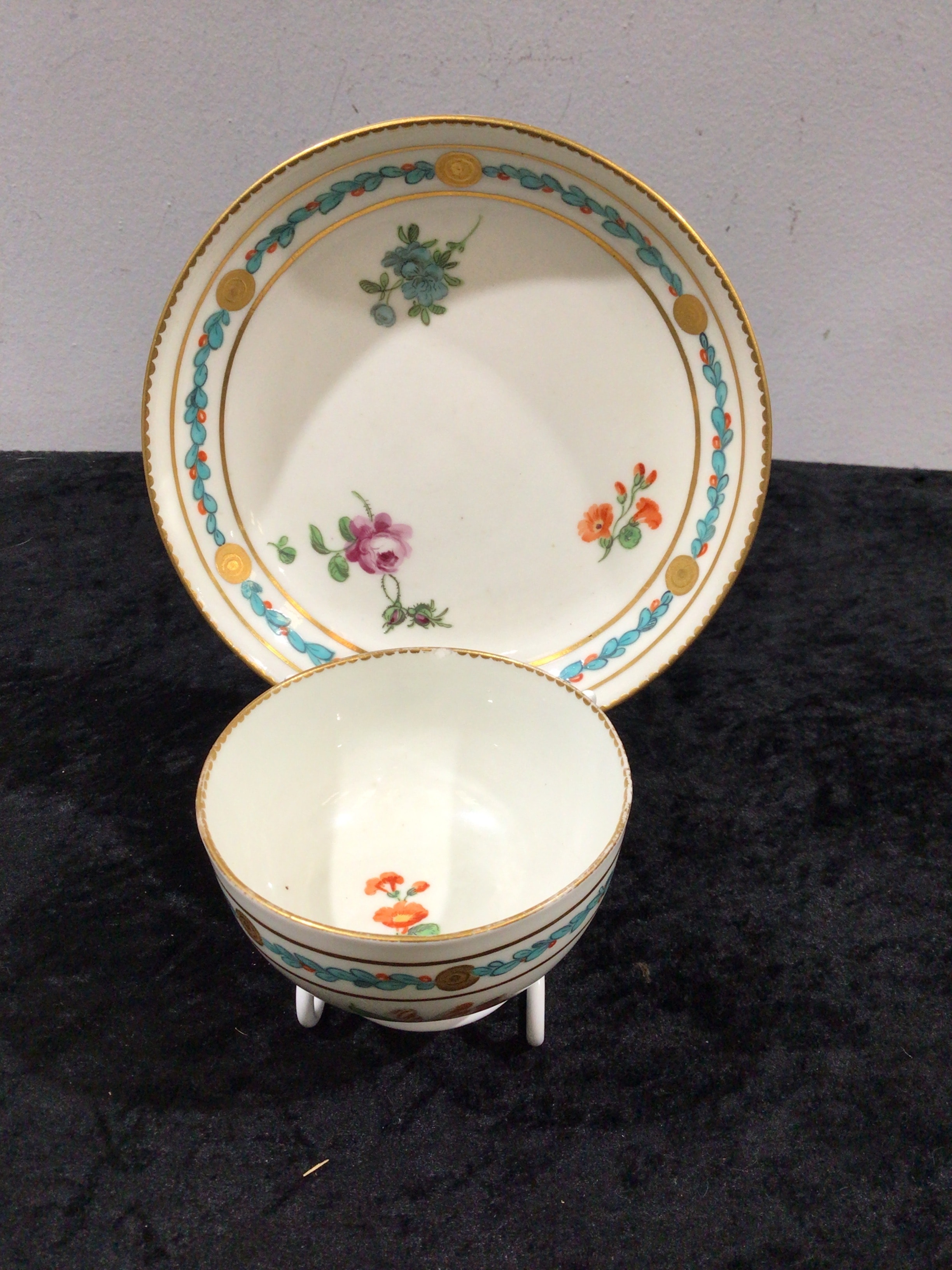 A Chelsea porcelain teacup and saucer, dating to circa 1752-56, crafted from bone porcelain. Both pieces are adorned with hand-painted polychrome floral sprays scattered across a plain white ground. A decorative border, featuring gilded lines, turquoise-blue scrolling foliage, and repeating gold medallions, encircles the rim of the saucer and the upper band of the bowl-shaped, footed cup. Each piece bears a small, hand-painted iron-red mark on its underside, resembling a stylized anchor or cross. Chelsea Pottery Mark