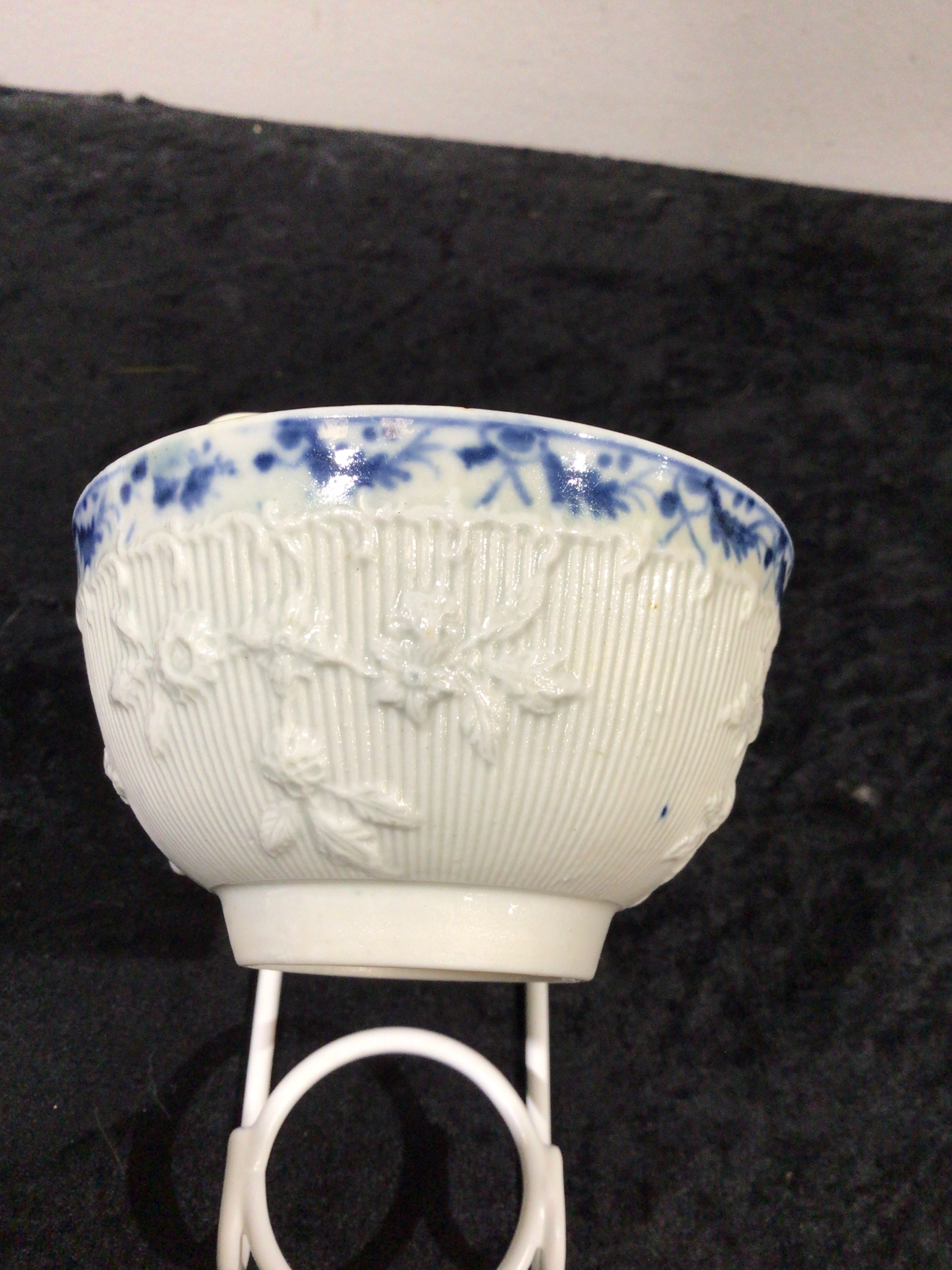 A Liverpool Pennington porcelain bowl, circa 1780. The white porcelain bowl features a molded fluted exterior with applied or relief floral decoration, accented by a blue-painted patterned band at the rim and sporadic blue highlights on the floral motifs. The interior is plain white with a similar blue-painted patterned border near the rim and a small, stylized blue floral or leaf motif in the center. Visible markings include a circular “PRIVATE COLLECTION” sticker on the interior base, and on the exterior base, a “ROBERT C JELLICOE” collection sticker, a green circular sticker with a number, and a white rectangular sticker detailing “Pcs – 100,” “Net weight 1.5 lbs,” “No. S/17,” “Royal China B&W Tea & Coffee Set – Plates Cups Bowls,” and dimensions “3.5 x 3.5,” with a handwritten price of “$195.00.”