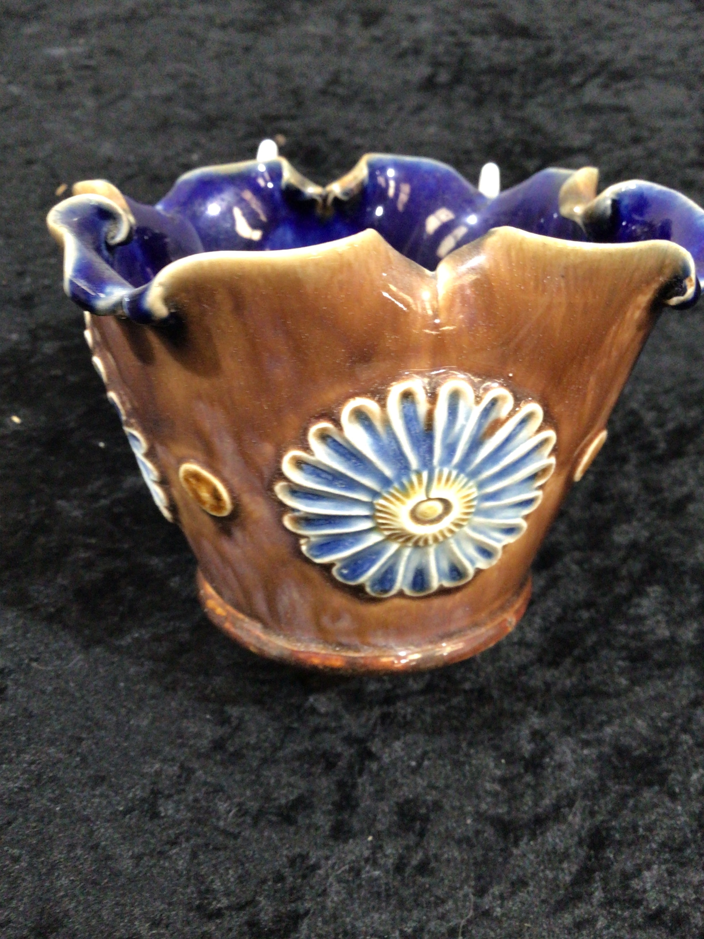 A Royal Doulton Lambeth stoneware bowl. The piece features a brown glazed exterior and a deep royal blue glazed interior. The exterior is adorned with molded blue and white/yellow daisy-like floral motifs and smaller circular accents, complemented by a distinctive scalloped and flared rim. The unglazed base reveals a light buff clay body and several impressed marks, including “bbb bbb”, a circular manufacturer’s emblem with indistinct text, and a smaller stamped ‘2’ or ‘Z’ possibly indicating a mold number.