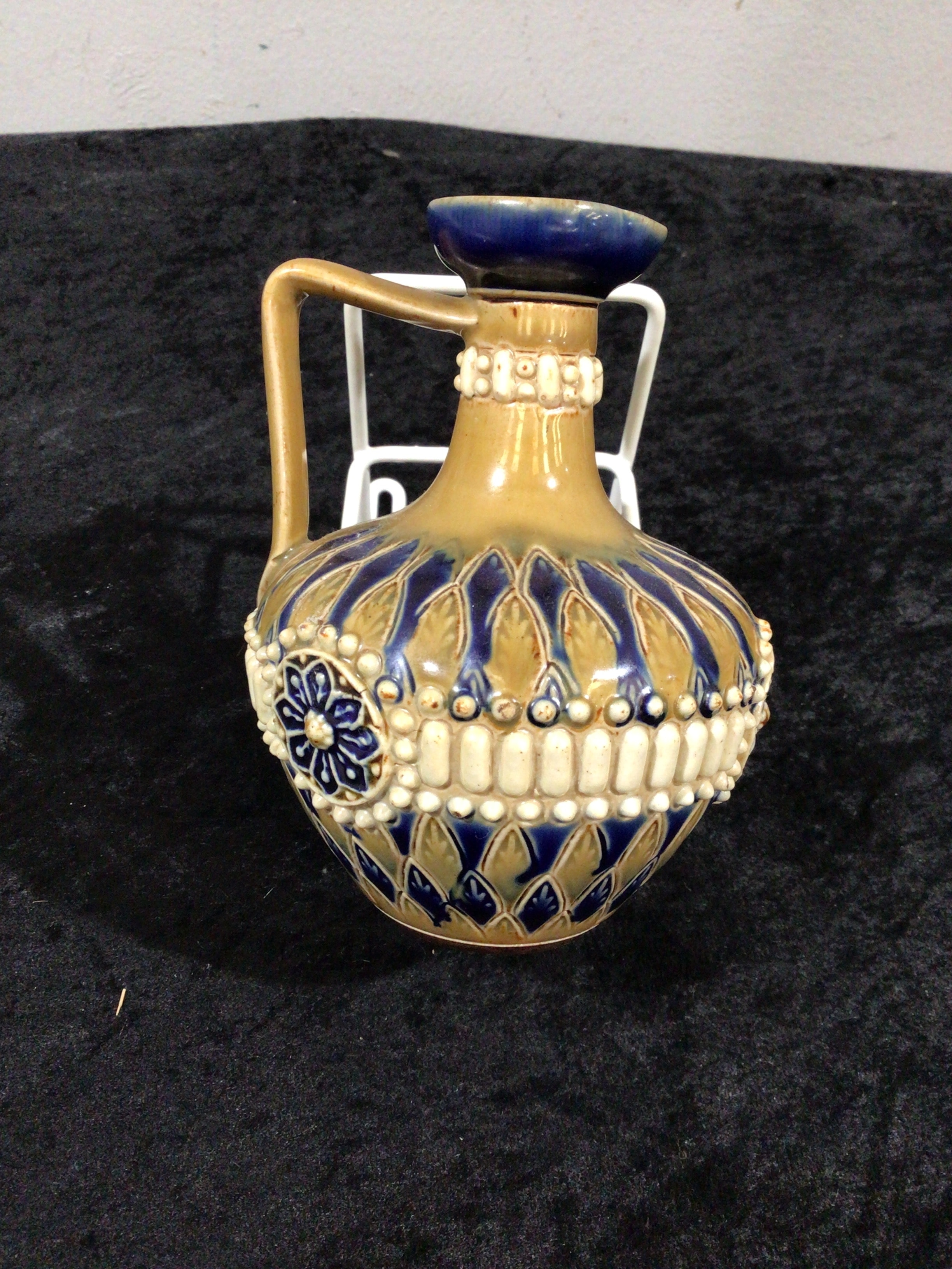 A Doulton Lambeth stoneware ewer, featuring a bulbous body, a tan handle, and a flared dark blue spout. The body is extensively decorated with relief-molded patterns in alternating dark blue and tan/ochre glazes, depicting stylized foliate motifs, accented by bands of raised white beading and a prominent blue and white floral medallion. The base bears an impressed circular mark surrounding a stylized flower, reading “DOULTON LAMBETH” and “ENGLAND,” alongside the impressed pattern number “8807” and additional smaller impressed marks including “J” and “P”.