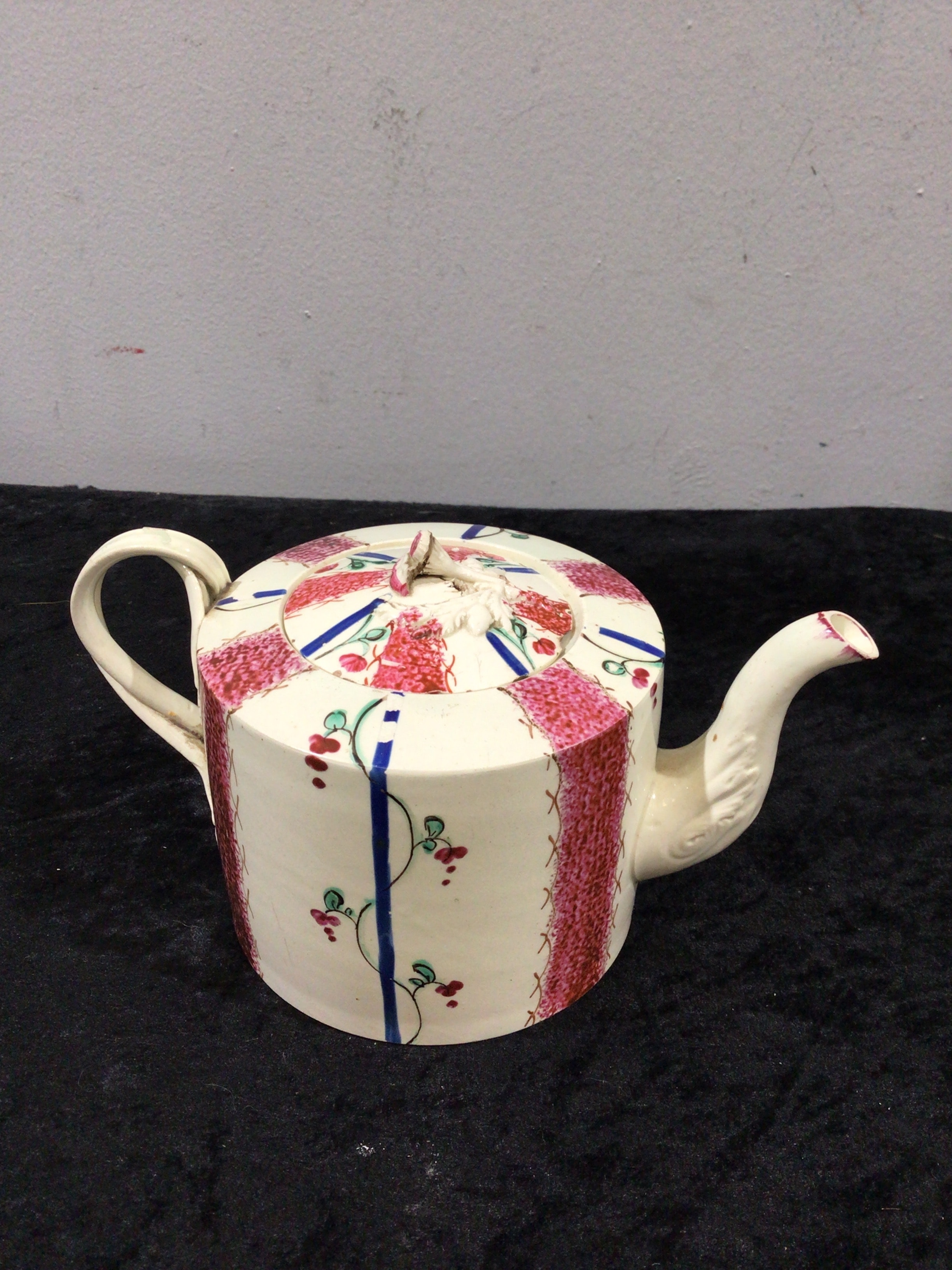 A flat-topped cylindrical earthenware teapot, identified by a handwritten label on its base as ‘Leeds Ware from 1769 to 1784’. It features hand-painted enamel decoration, consisting of alternating pink cross-hatch bands and blue vertical stripes, interspersed with stylized floral sprigs in red, green, and blue. The moulded handle and spout are undecorated. Restoration item.