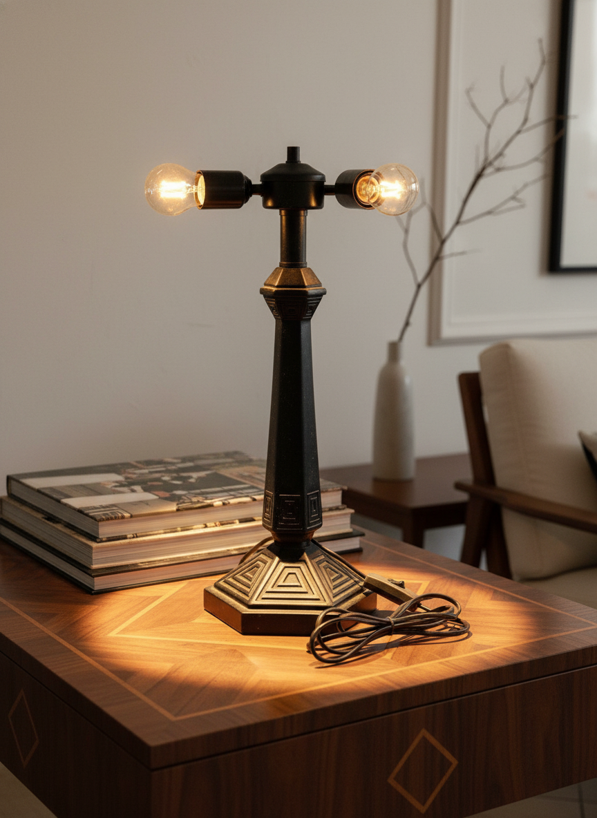 A dark grey/black Art Deco style table lamp base with two bulb holders and an attached cord featuring a plug marked “BS 1363” and “13A”.