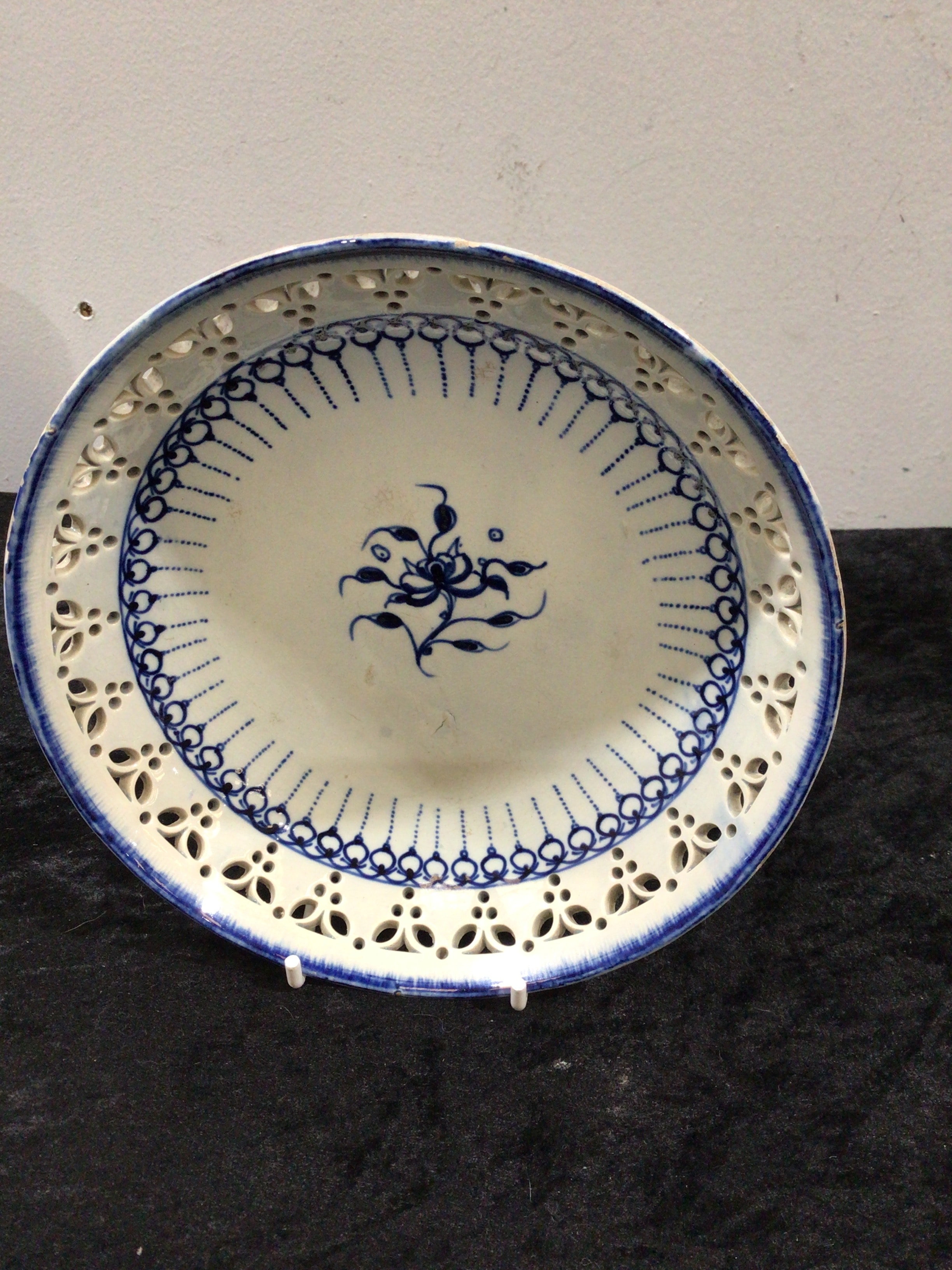 An English Pearlware blue decorated reticulated plate, circa 1800. This round, shallow ceramic plate, likely porcelain, features underglaze cobalt blue decoration on a white body. The central well displays a stylized floral motif with scrolling foliage, characteristic of East Asian influence or Chinoiserie styles. An inner border encircles this motif with a band of fine blue dots or dashes. The rim is prominently reticulated, featuring a pierced, openwork design with decorative cutouts, bordered by a solid blue line. No manufacturer’s marks or text are discernible.