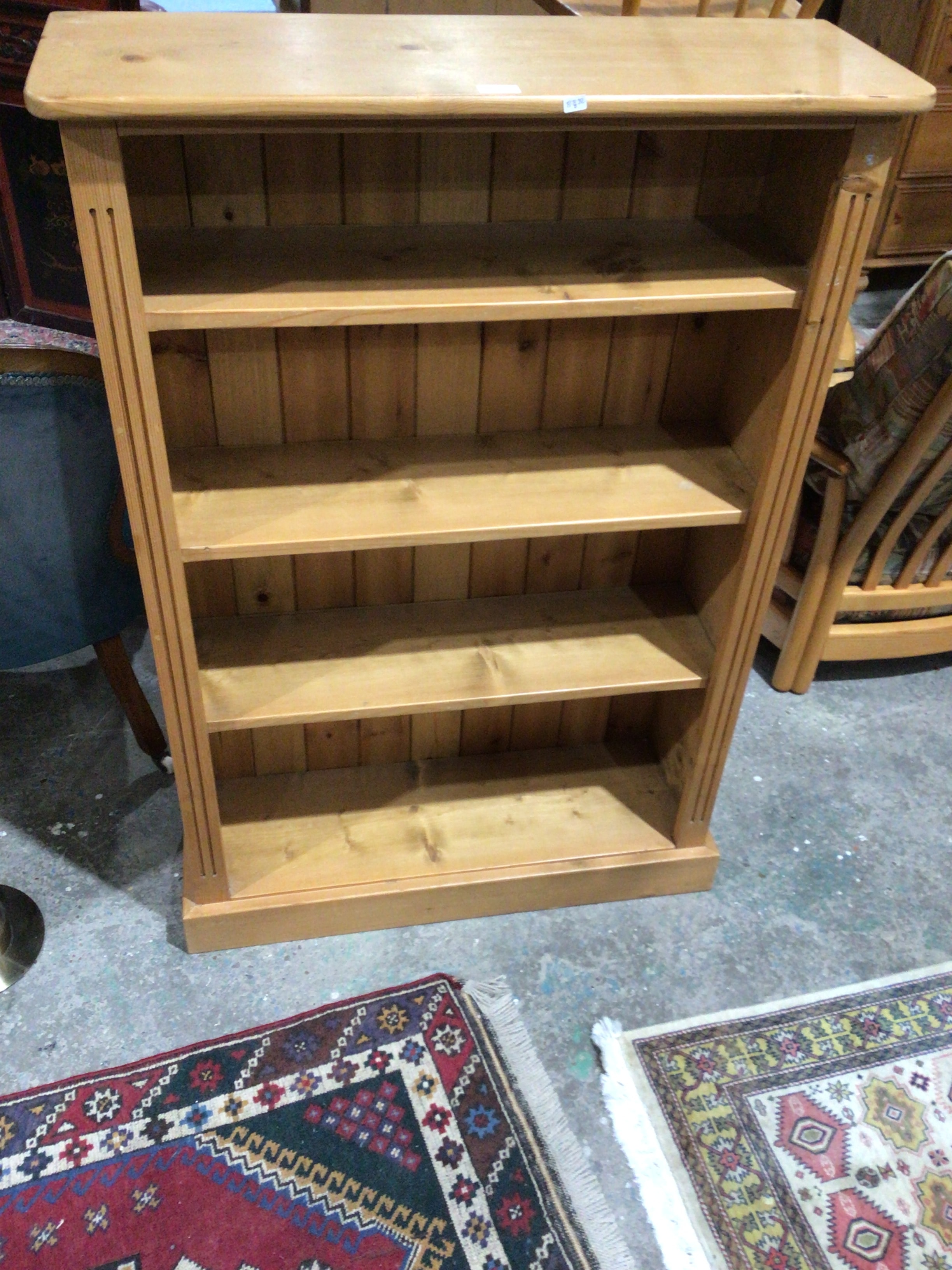 A modern, light-toned wood bookcase or open shelving unit, likely constructed from pine or a similar softwood, featuring a clear natural finish. The design is simple and utilitarian, with four fixed shelves creating five compartments. It is detailed with a triple-line routed motif on the vertical stiles. A small white sticker on the top shelf displays partially visible blue Korean text, “아동재” (adong jae), which translates to “children’s goods” or “children’s materials.”