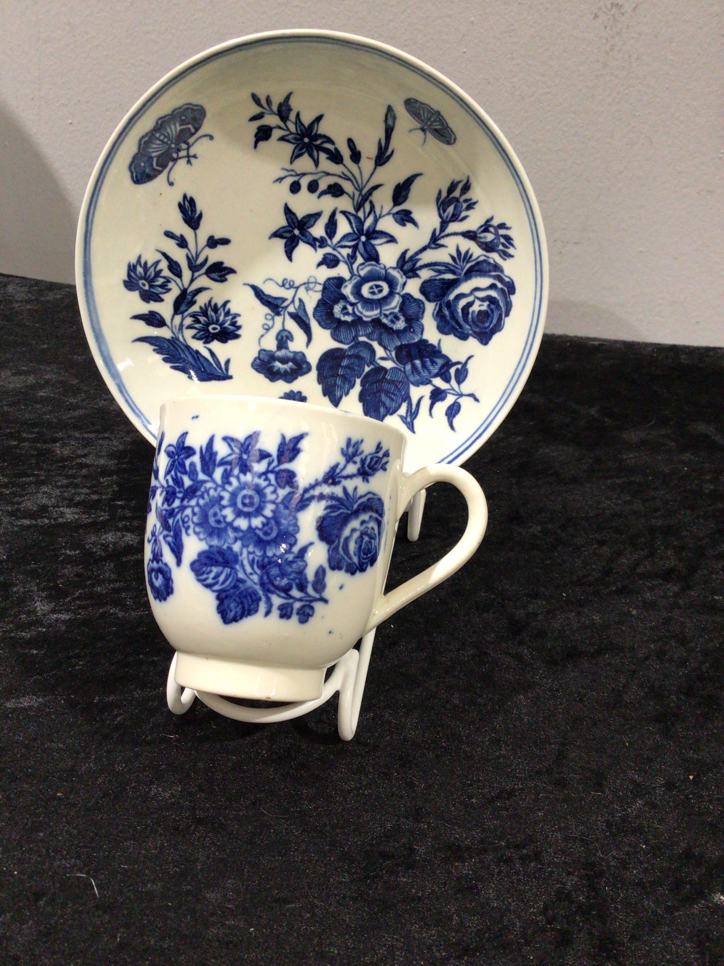 A Liverpool Pennington Porcelain Three Stamen Pattern Teacup and Saucer, decorated in an underglaze blue on white palette. The design features a continuous pattern of stylized floral motifs, including roses and various blossoms with foliage, complemented by butterflies on the saucer. The overall style suggests a classic European blue and white tradition, possibly influenced by Chinoiserie. The saucer’s underside bears a visible blue maker’s mark resembling a stylized ‘M’ with a flourish.