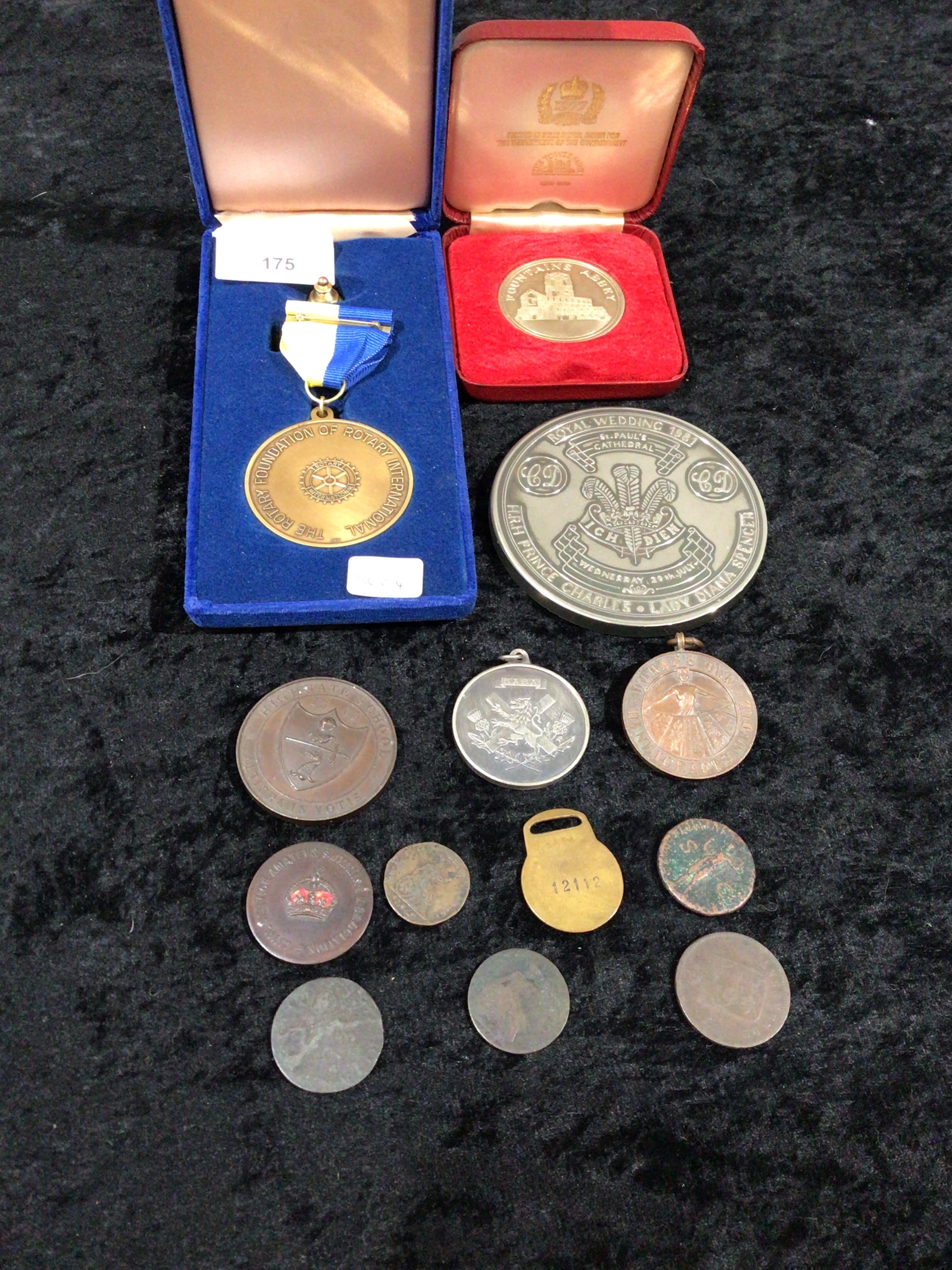 A Collection of Medals, Medallions, and Tokens, including a Rotary International Foundation Medal, a Royal Wedding 1981 Medallion, and a Fountains Abbey Commemorative Medallion