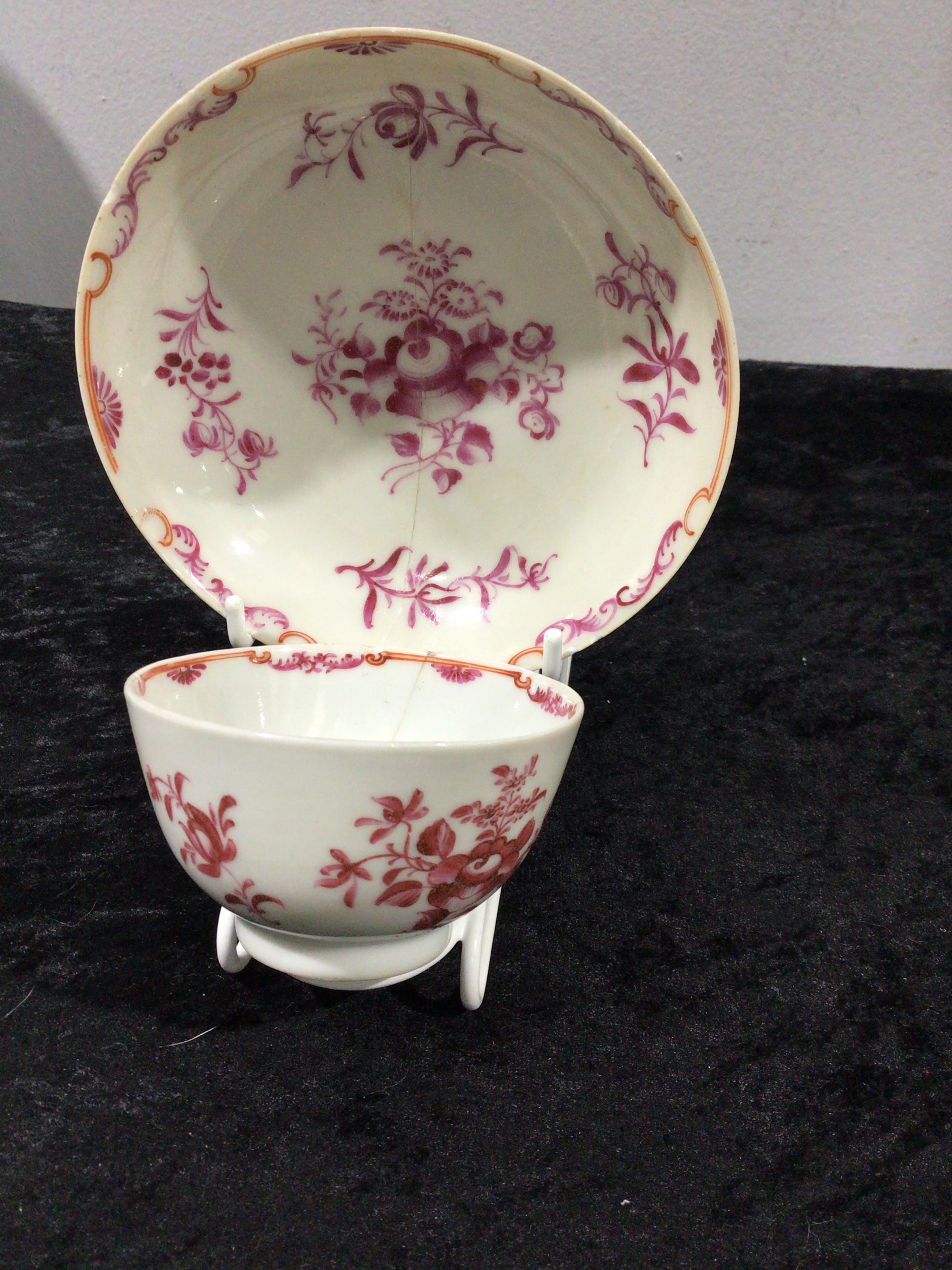 A porcelain tea cup and saucer, each featuring a white ground. The overglaze decoration is rendered in shades of puce or magenta, depicting floral motifs, leaves, and berry clusters, accented by orange-red lines along the rims. The saucer’s interior is adorned with a central floral bouquet surrounded by a scrolling border pattern. The cup is decorated with smaller, scattered floral sprigs. No manufacturer’s marks are discernible.