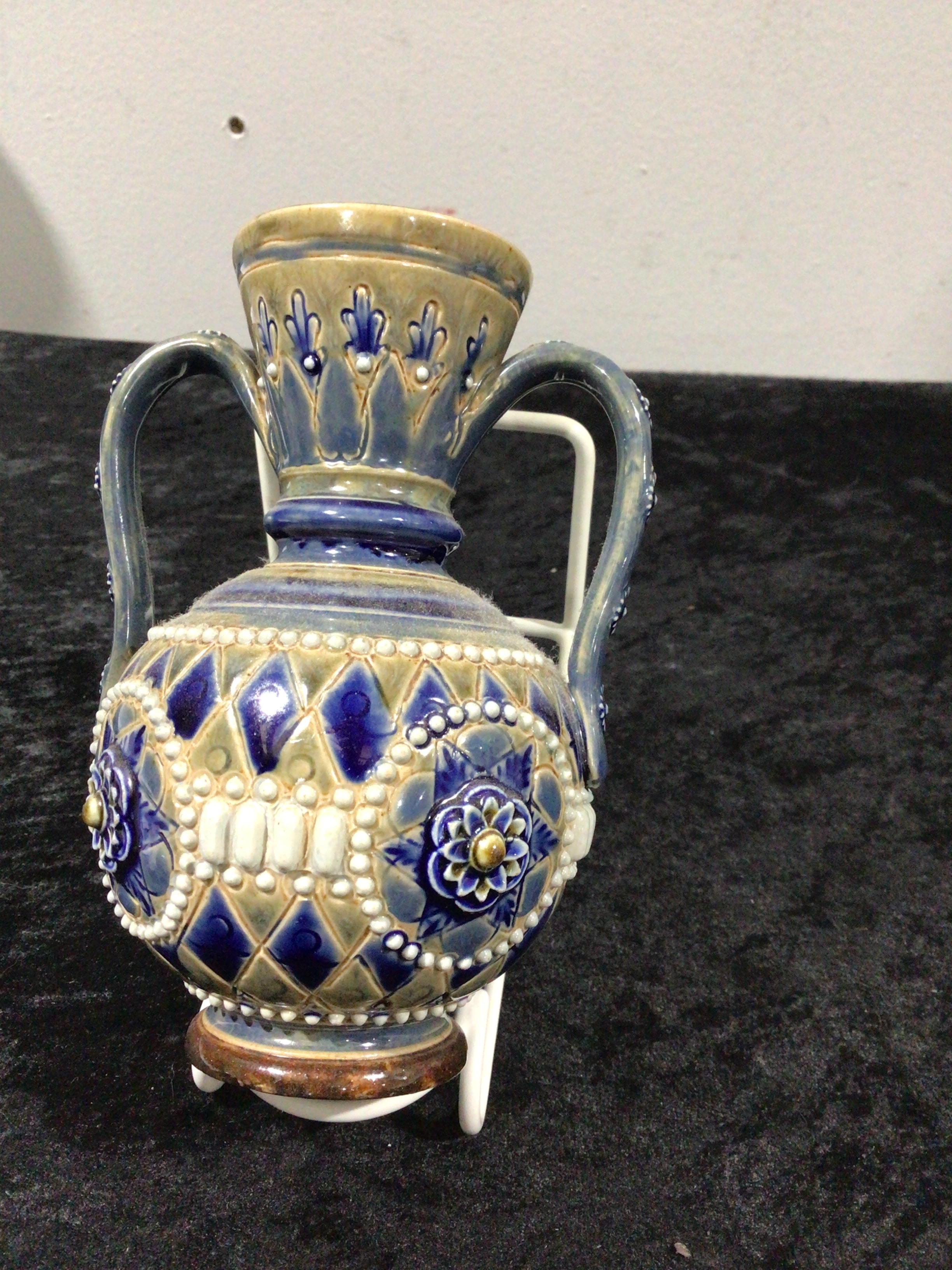 A Doulton Lambeth twin-handled vase, crafted from glazed stoneware. This bulbous form features elaborate relief-molded decoration in deep blue, cream, and muted tan hues, showcasing diamond patterns, floral medallions with central gold-colored accents, and rows of raised white dots across its body and handles. The flared rim is also decorated. The base bears an impressed mark reading ‘HAMILTON LAMBERTS’ beneath a crown-like motif, with an apparent ‘V’ or ‘A’ above it.