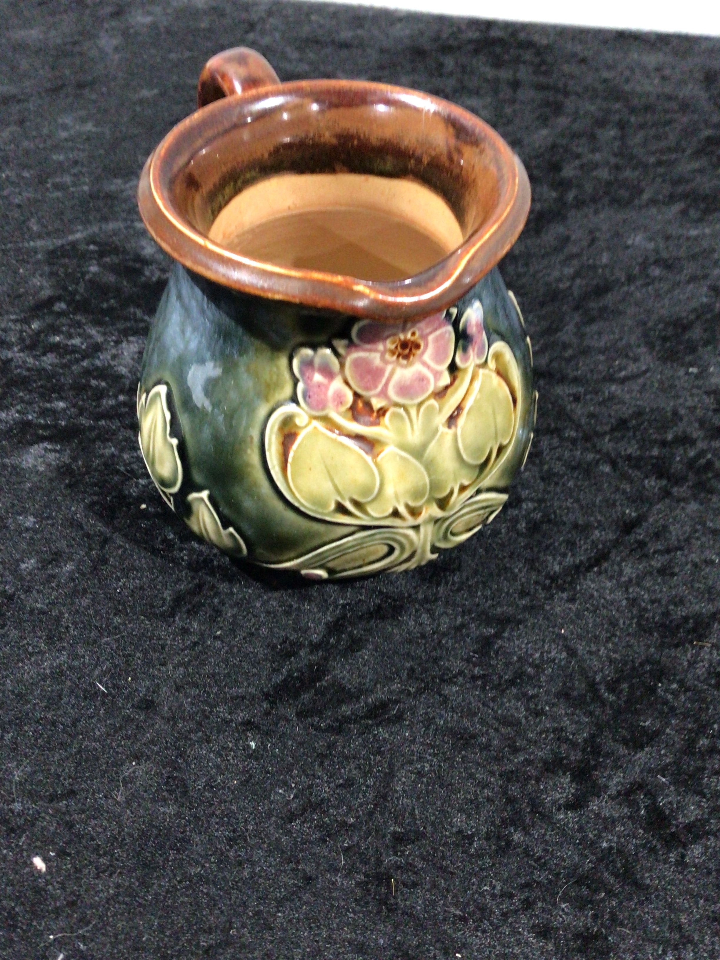 A Royal Doulton Lambeth Art Nouveau stoneware jug, featuring a rounded body, a single handle, and a flaring rim. Its exterior displays relief-molded and hand-painted floral motifs, including pink blossoms and green foliage, on a variegated dark green to blue ground. The interior and rim are finished in a rich brown glaze. The base bears impressed marks including “Moorcroft,” “MADE IN ENGLAND,” and an incised “W.18.O,” along with what appears to be a cursive “WM” initial mark.