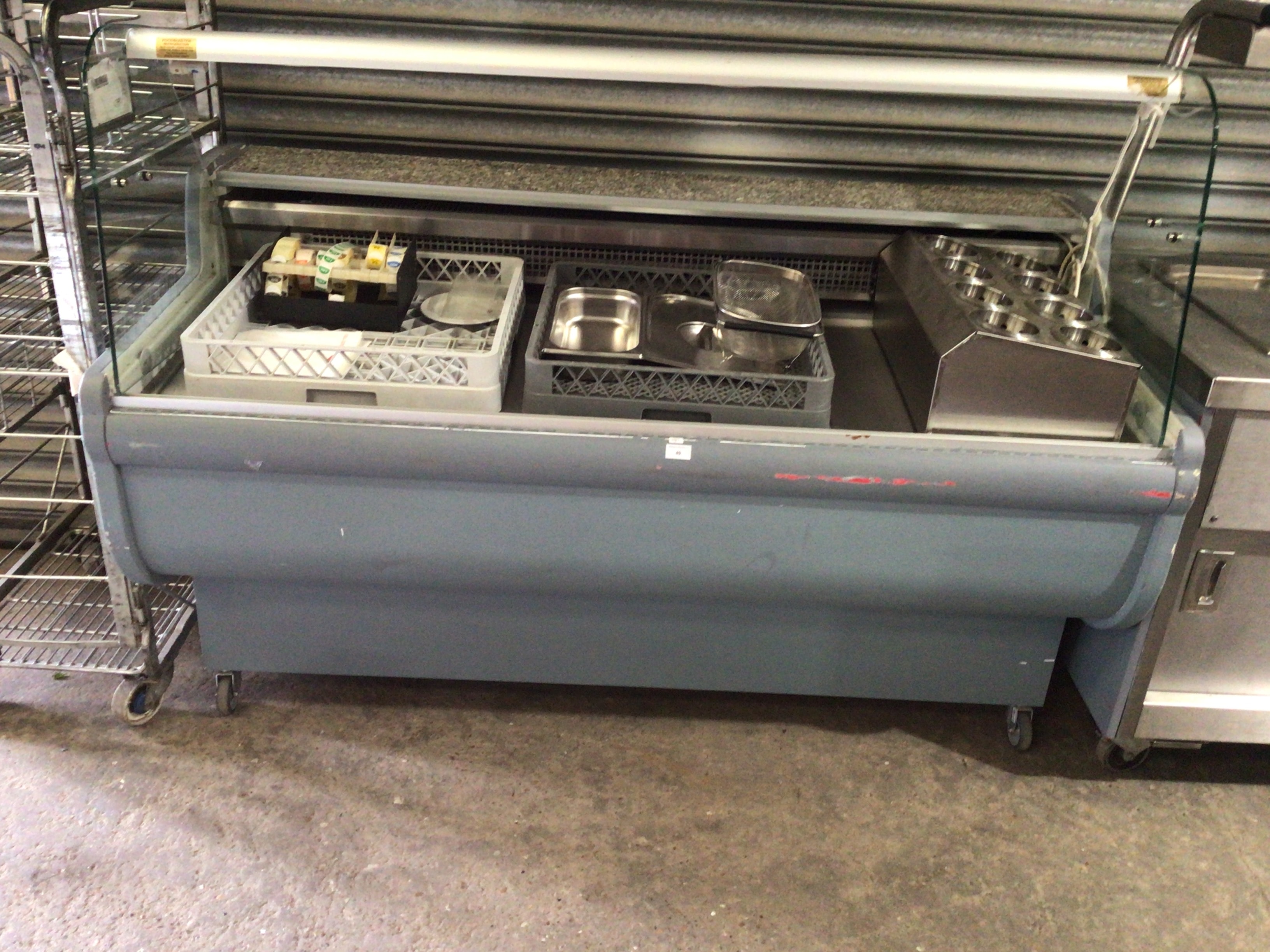 A Hussmann commercial mobile display case, likely designed for refrigerated or heated food items. The unit features a grey composite or painted metal body, a clear glass viewing front, and stainless steel interior compartments suitable for gastronorm pans. It includes a grated serving surface and is fitted with a roll-down security shutter above. The case is equipped with casters for mobility. A yellow ‘FOODMASTER’ brand label is present on an overhead light fixture, and a white inventory label with the number ’49’ is affixed to the front panel.