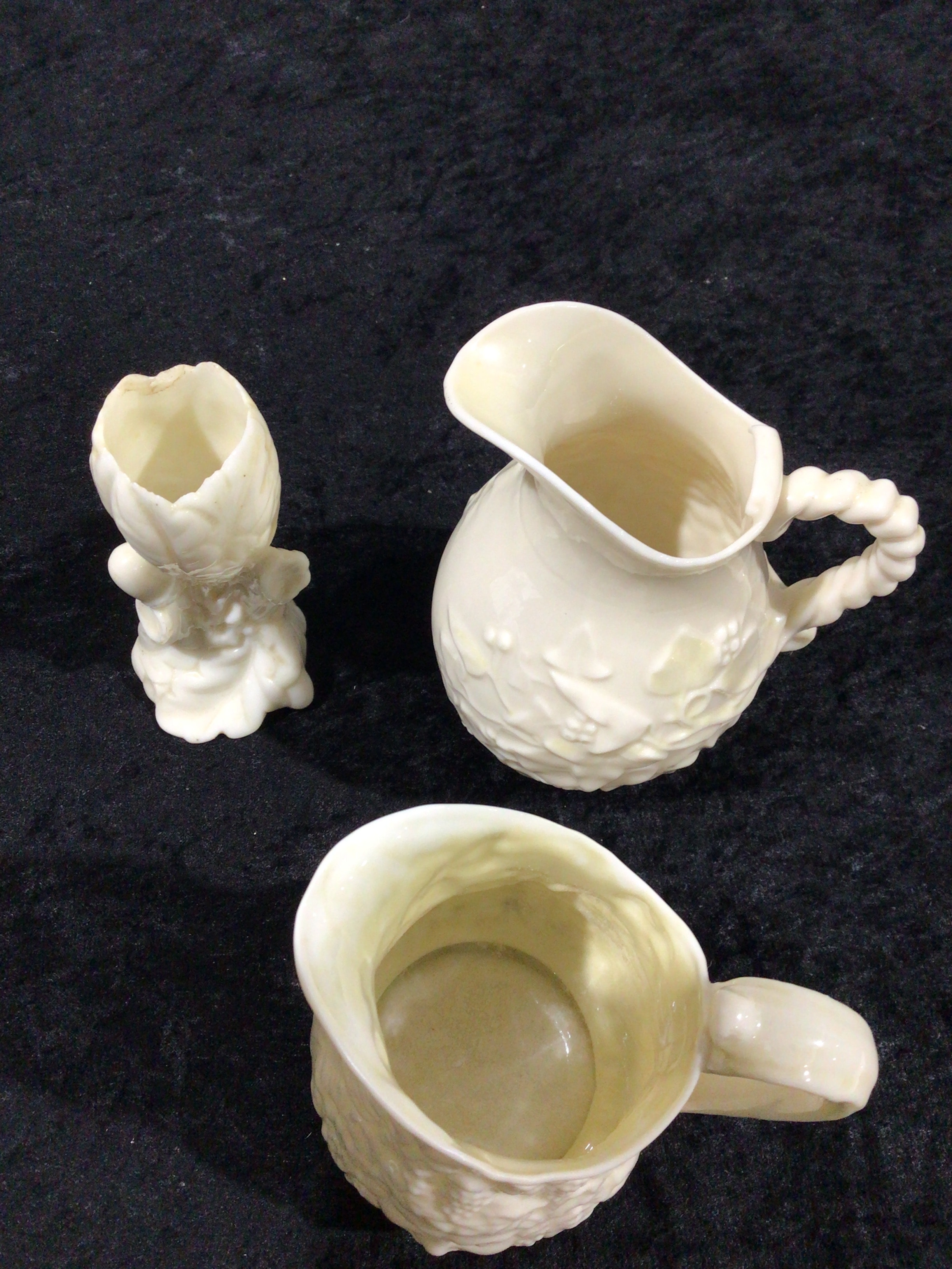 Two Belleek 'Ivy' Pattern Yellow Lustre Creamers and a Figural Spill Vase, 3rd Black Mark (1926-1946)