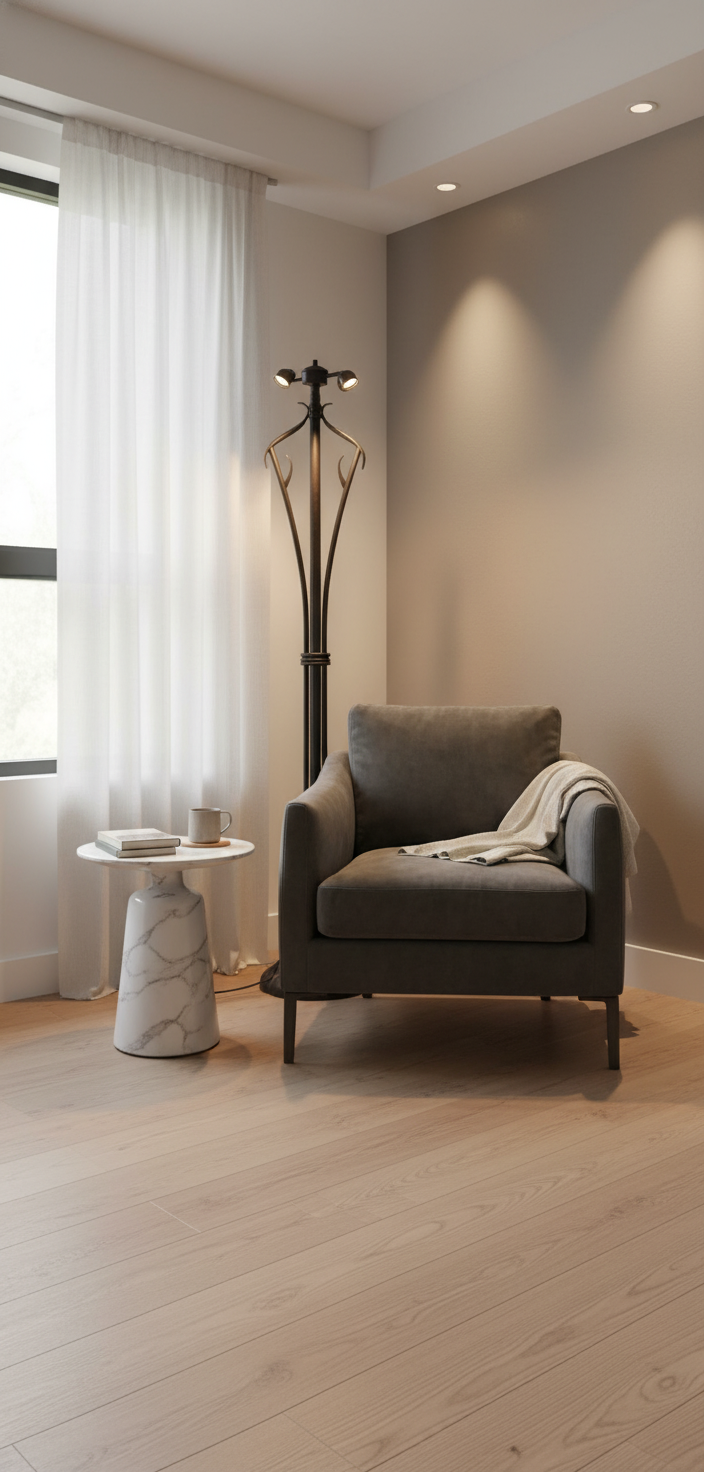 A dark brown/black ornate metal floor lamp features a decorative stem and base with three bulb sockets at the top.