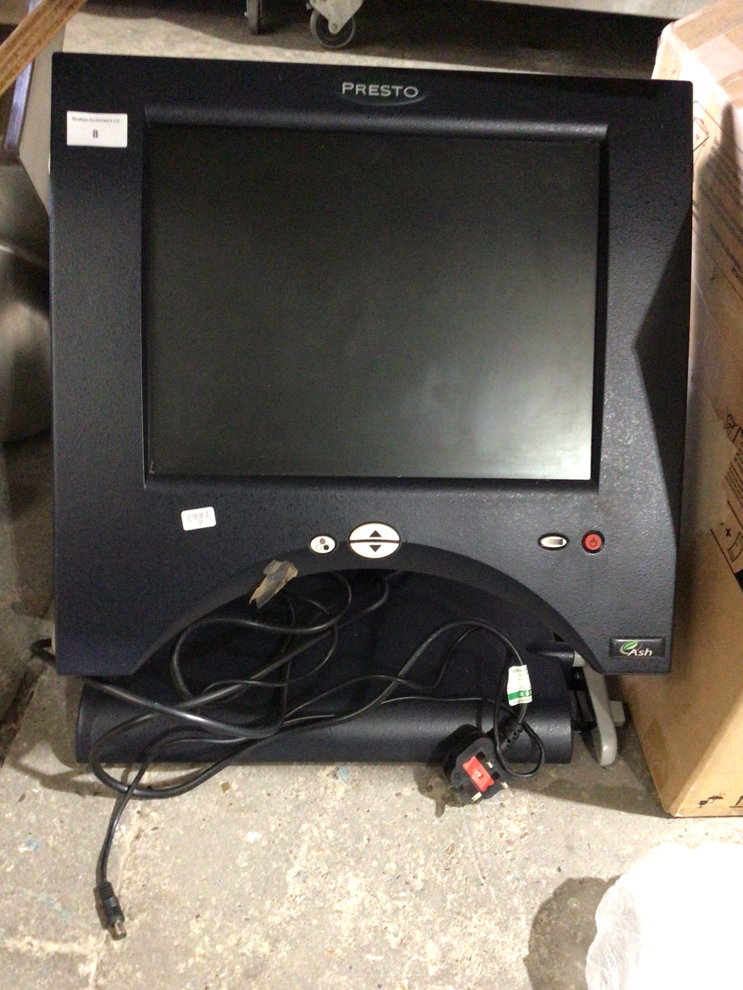 A black, matte plastic-cased electronic display unit, likely a specialized monitor or industrial inspection screen, dating from a late 20th to early 21st-century period. The unit features a prominent rectangular screen, with controls for power, zoom/focus (indicated by up/down arrows), and a multi-setting button (marked with three dots). The brand “PRESTO” is embossed at the top of the casing, and a stylized “Ash” logo with a leaf design is present on the bottom right. A sticker on the top left indicates “Microlux Instruments Ltd” with the number “8” below, and another partially obscured sticker on the lower left front shows “2382”. Various cables, including a UK 3-pin power plug, are tangled at the base of the unit.