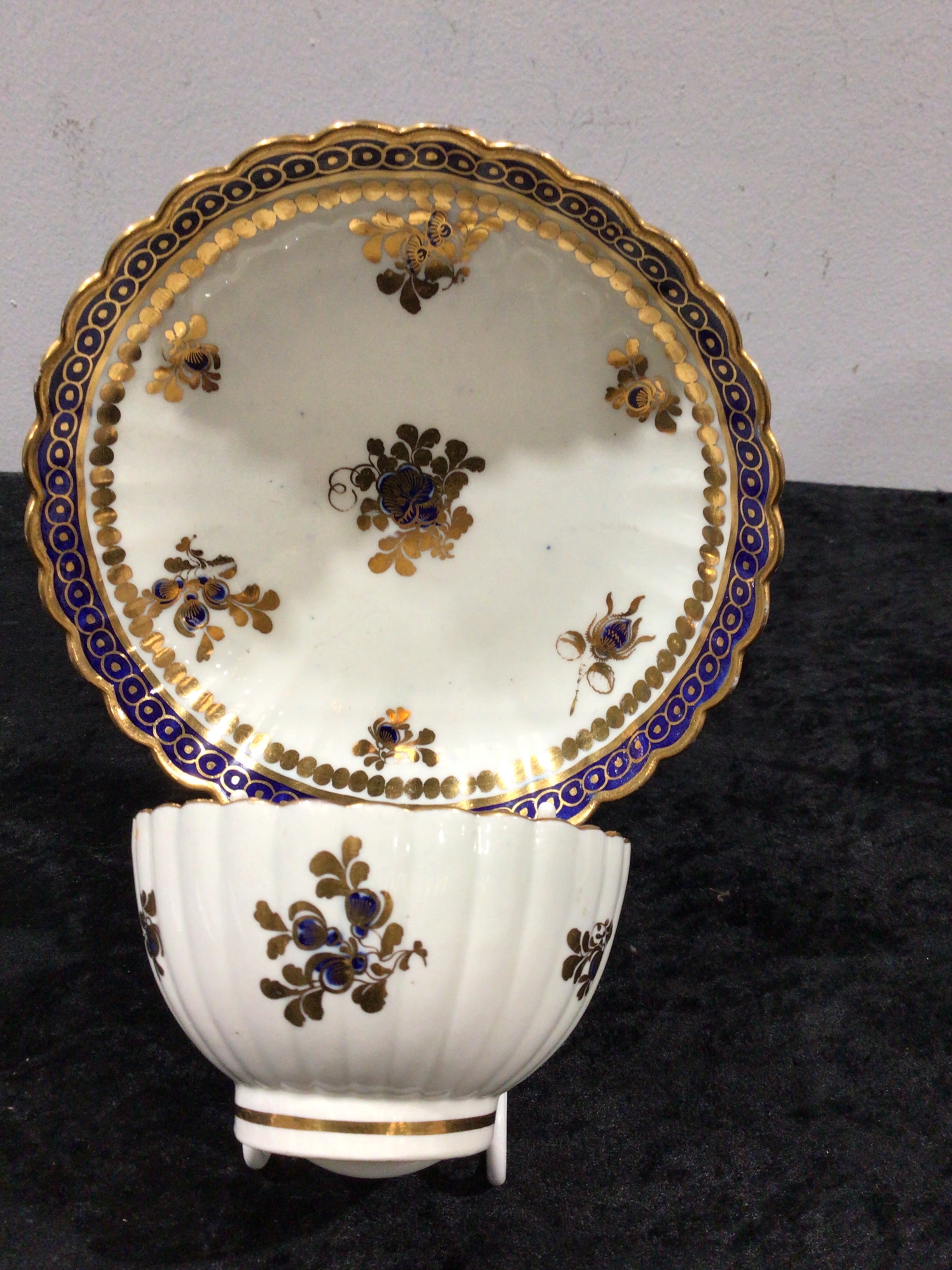 A Caughley Cobalt & White Highly Gilded Cup and Saucer, circa 1790. This two-piece porcelain set features a white ground with extensive gilding and cobalt blue accents. The saucer has a scalloped rim adorned with a broad band of gilt dots alternating with a blue border containing gilt circles, and scattered gilt and blue floral/foliate motifs in the well. The fluted cup features a scalloped rim, gilt foot, and complementary scattered motifs, including a distinctive gilt and blue insect (possibly a bee) inside its base. Both pieces bear a small, underglaze blue mark, resembling an “S.” or “5.”, on their undersides.