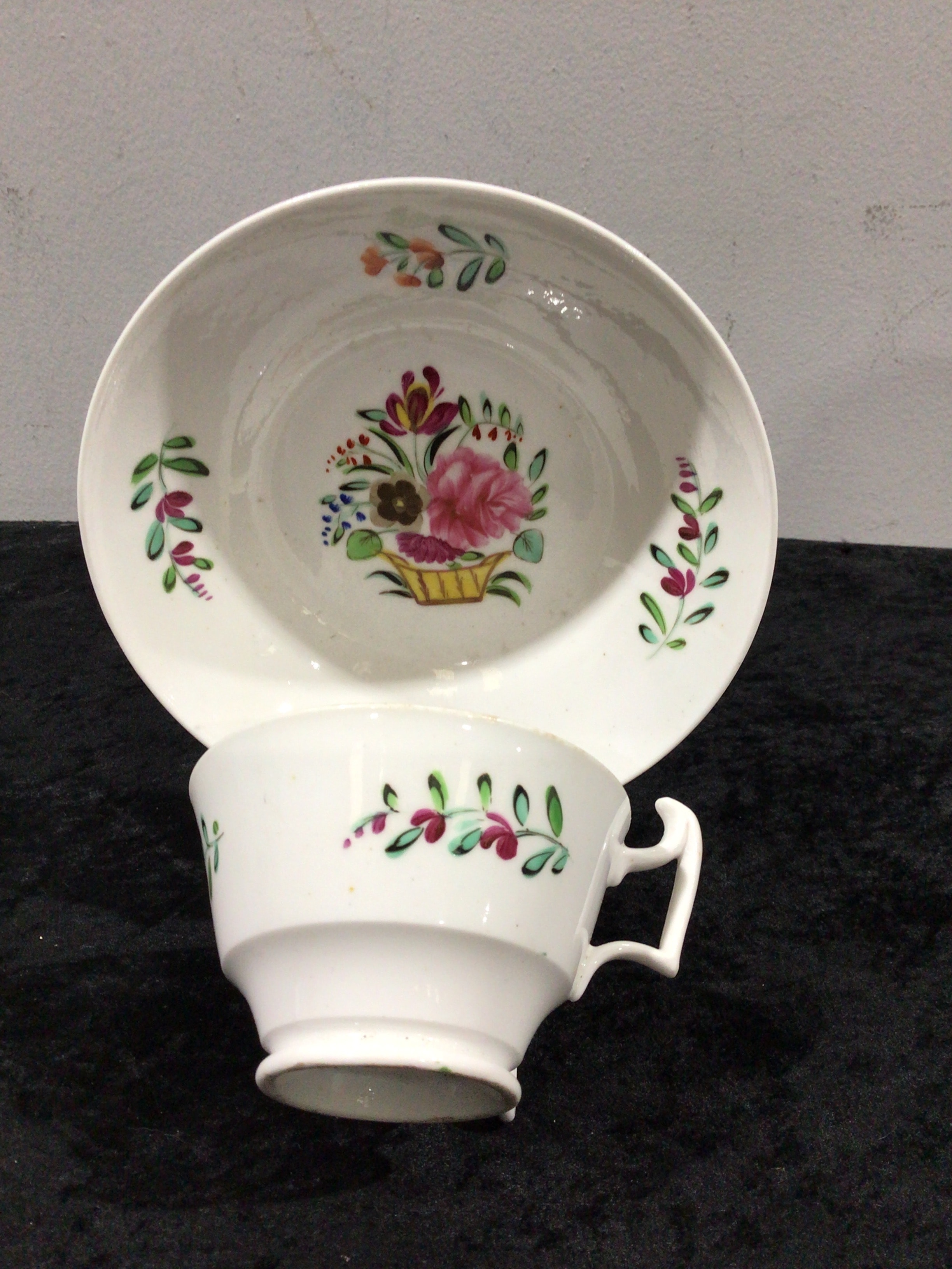 A English Derby Polychrome Hand-Painted Porcelain Cup and Saucer Set, Late 18th/Early 19th Century