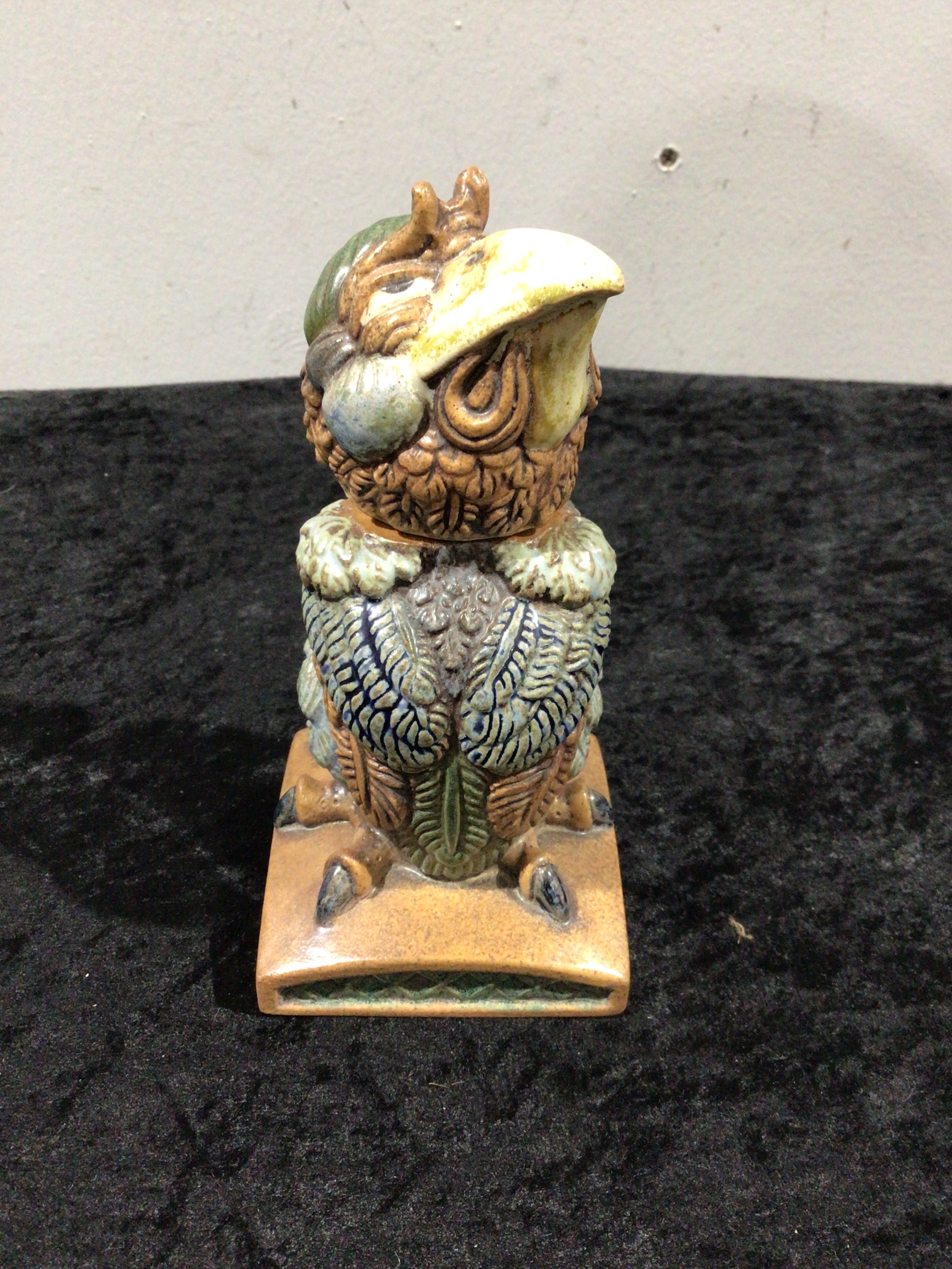 An Andrew Hull for Cobridge ceramic stoneware grotesque Wally Bird jar and cover. This two-part glazed ceramic lidded vessel depicts a highly stylized, textured bird-like creature, possibly an owl or griffin, on a rectangular base. The design exhibits a whimsical or folk art style, featuring deeply molded details and a multi-colored palette of earthy browns, greens, blues, and creams. The underside of the unglazed base bears blue ink or marker notations ‘SS’, ‘TB’, and ’08’, along with an incised mark resembling ‘AH’ and some faint, illegible impressed text. The separation of its two parts is clearly intentional.