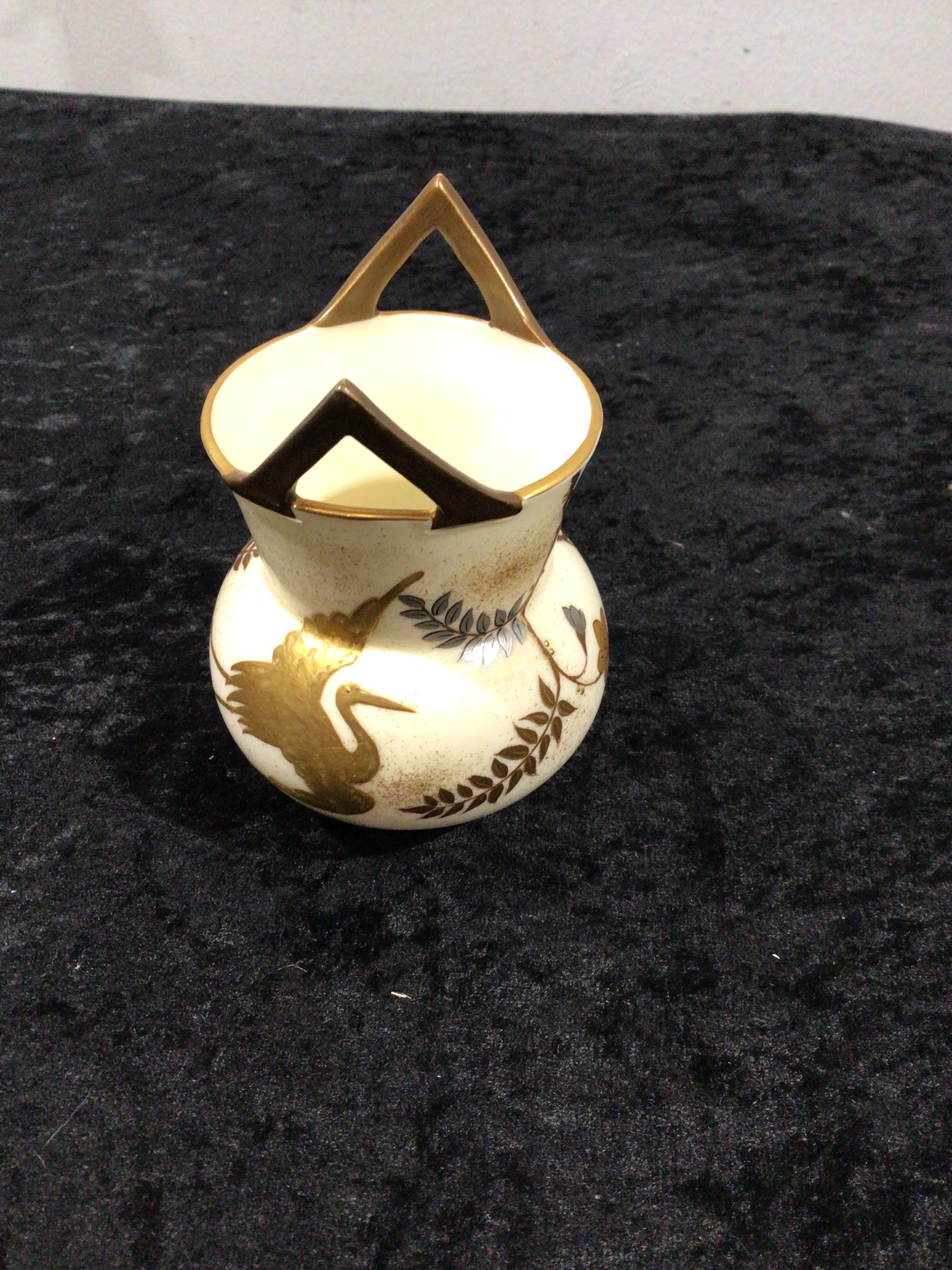A Royal Worcester ‘Old Ivory’ Aesthetic Movement small vase, crafted from porcelain or fine earthenware with a glossy cream-colored glaze. It features extensive gilt decoration, including a prominent crane-like bird, winding foliate designs, and smaller dark grey/blue floral motifs. The rim and two upward-sweeping angular handles are also gilded. The base bears a green underglaze factory mark depicting a crown atop an intertwined monogram (likely ‘RC’) within an oval, with a number ‘2’ below, consistent with Royal Worcester production from the late 19th century.