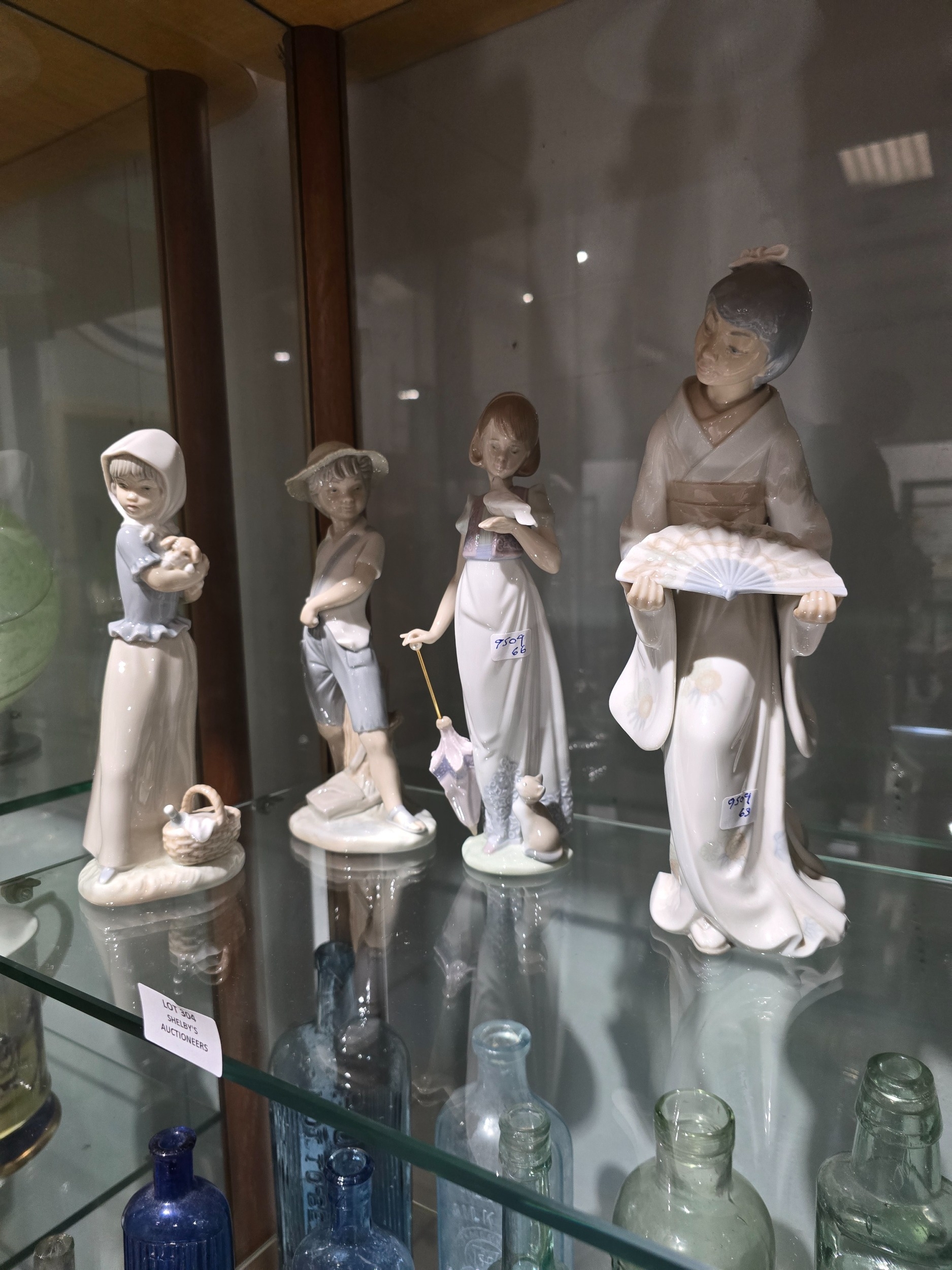 2 X NAO AND 1 X LLADRO FIGURINE GIRL WITH CAT AND BIRD GIRL WITH PUPPY AND BOY WITH SLINGSHOT 1 X NAO ORIENTAL LADY FIGURNE HOLDING FAN