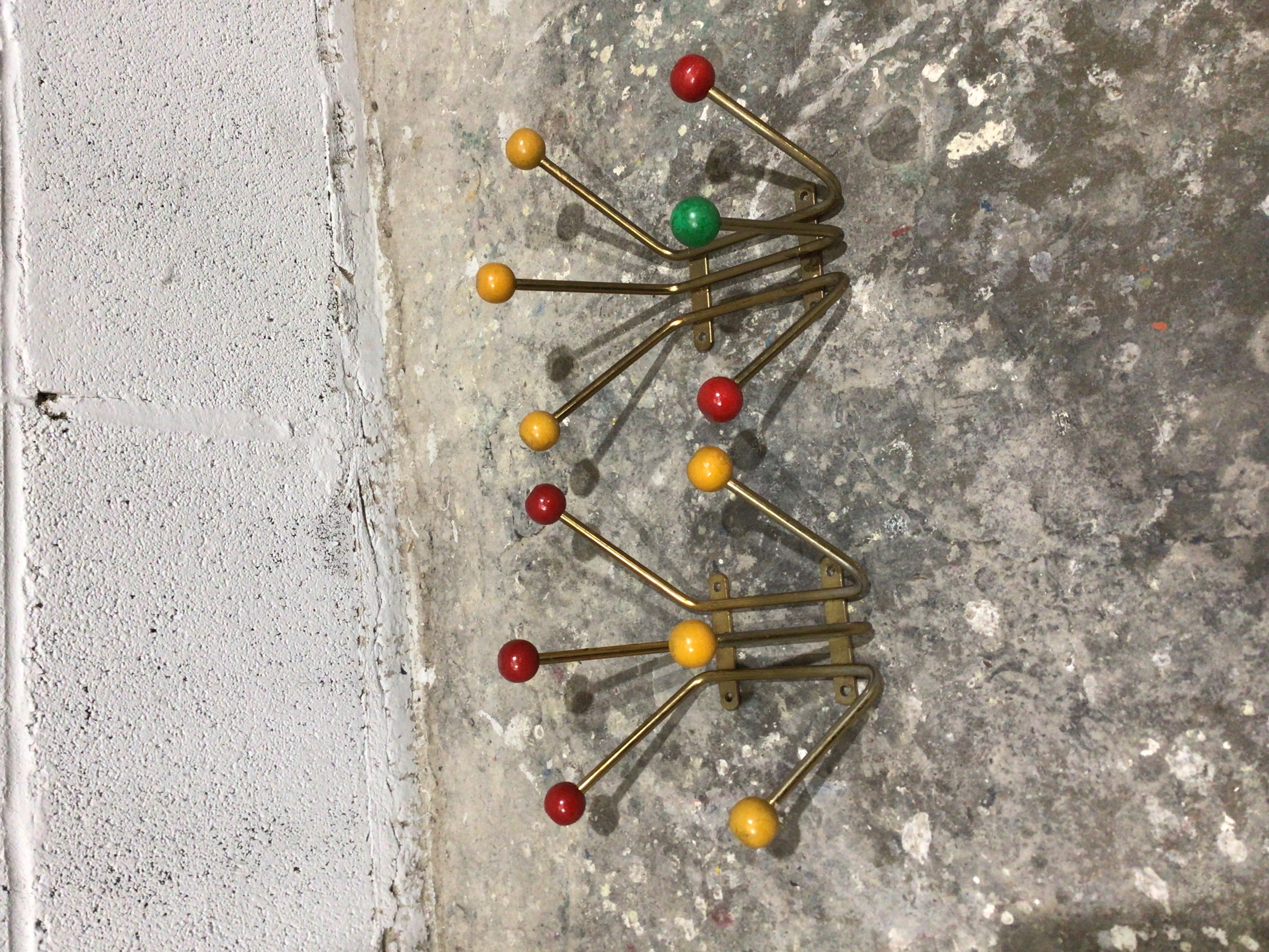 A pair of Mid-Century Modern wall-mounted coat racks, each featuring a central mounting plate from which multiple brass-toned metal rods extend, capped with brightly colored spherical finials. The finials are predominantly red and yellow, with one green sphere visible on the right-hand unit. The design is characterized by its splayed rods and colorful spheres, indicative of a mid-20th century aesthetic. The metal components exhibit a visible patina consistent with age. No visible text, maker’s marks, or labels are discernible.