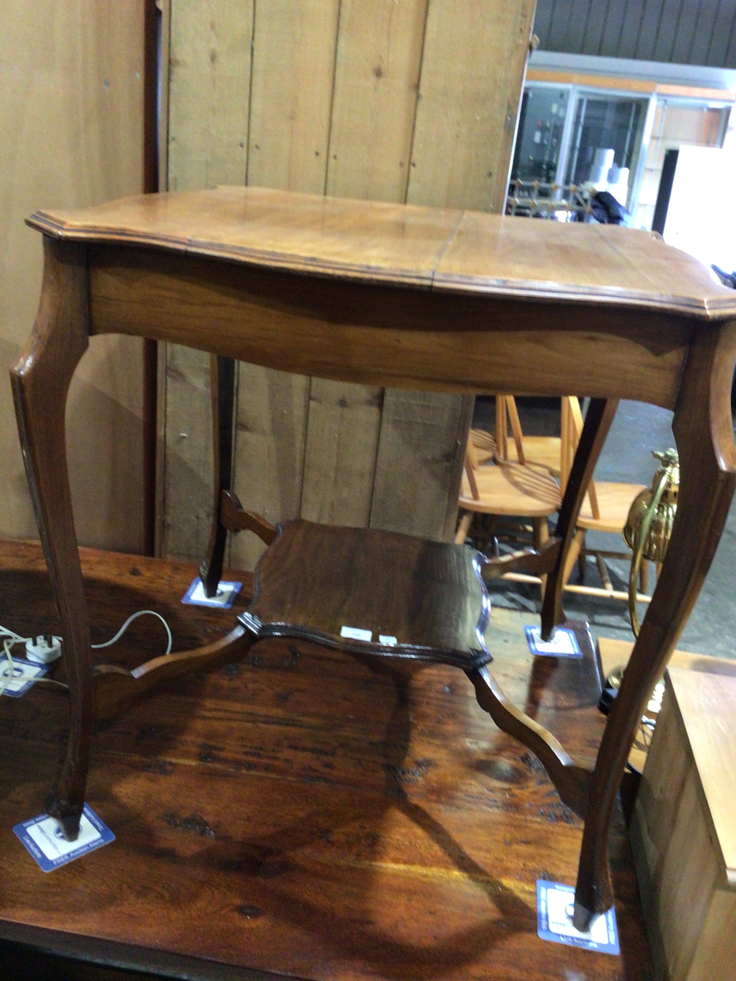 A hardwood occasional table in the French Provincial style, dating to the early 20th century. The table features an elongated, shaped top with visible seams, suggesting a sectional or drop-leaf design. It is supported by four elegant cabriole legs, which are joined by an X-form stretcher that supports a conforming undertier. Crafted from a warm-toned hardwood with a polished finish, the table exhibits sturdy construction. Small, unreadable blue and white adhesive labels are present on the feet and the undertier, with no other legible text or manufacturer’s marks visible.