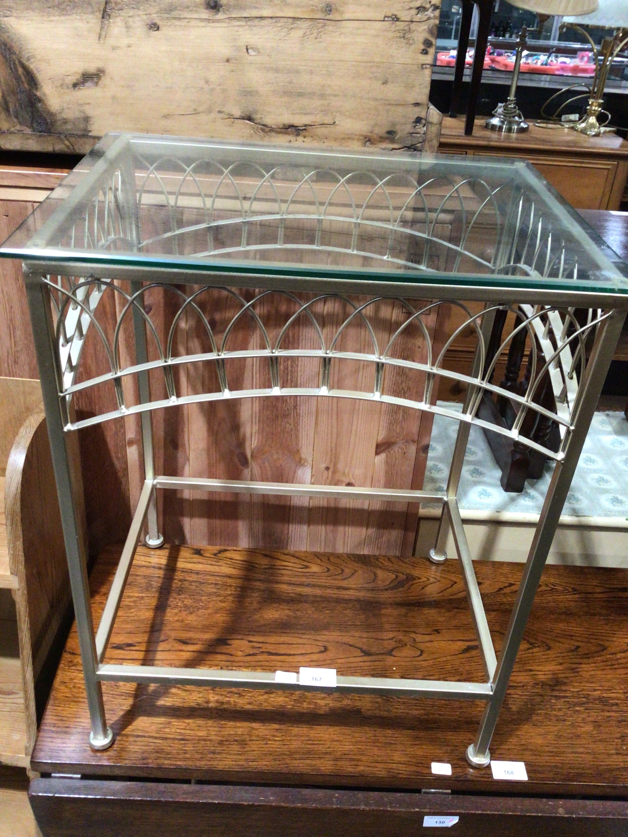 This modern square side or end table features a thick, clear glass top with polished edges. Its frame is constructed from light-toned, possibly champagne-finished metal, utilizing square-section legs and horizontal supports. A distinctive decorative element is present in the form of arched lattice-work panels connecting the upper and lower frames on all four sides, executed in an Art Deco style. No manufacturer’s markings or other text are visible on the item itself.