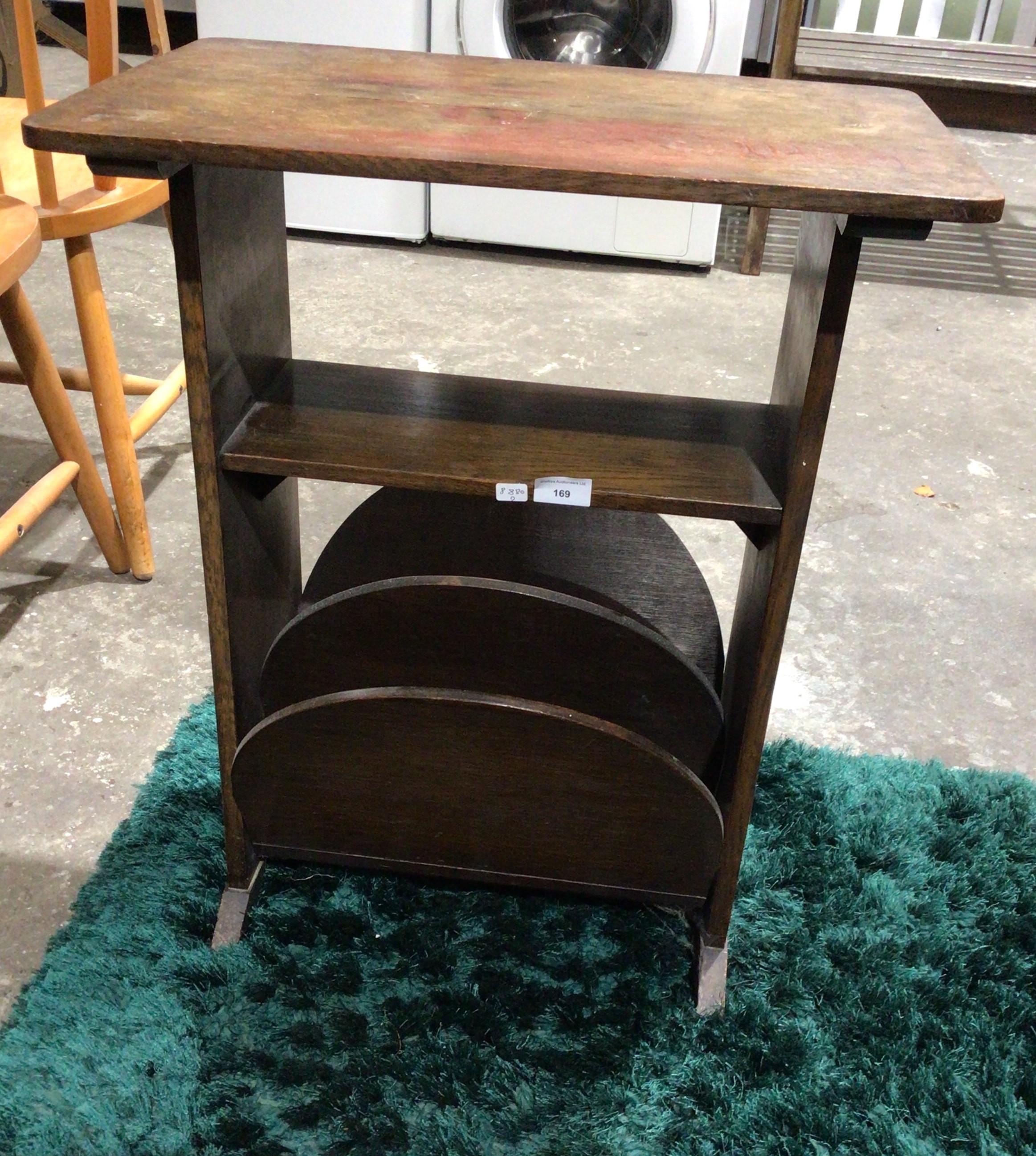 An Arts and Crafts style dark-stained oak side table, designed with functional storage. It features a rectangular top surface, an open shelf, and two tiered, curved compartments suitable for magazines or records. The construction is simple and robust, characterized by rectilinear forms. Visible markings include two white auction stickers on the open shelf: one marked ‘169’ with smaller numbers ‘8380 G’ above it, and another larger sticker reading ‘Bradleys Auctioneers Ltd’ (English) and ‘169’.