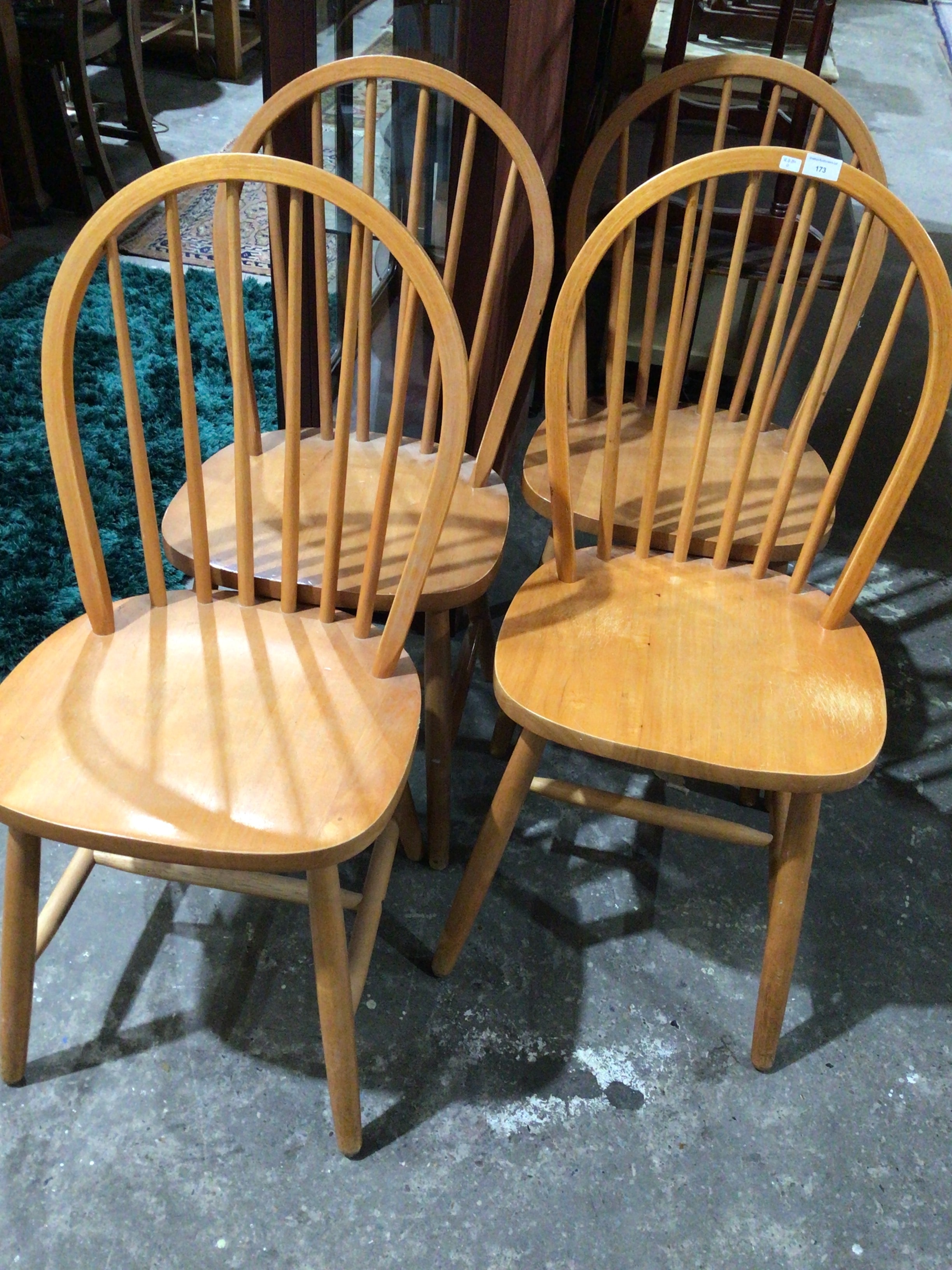 A set of four matching wooden dining chairs, crafted from a light-toned wood, possibly beech or birch, with a clear finish. The chairs are designed in a contemporary or mid-century modern interpretation of a bow-back Windsor style, characterized by a curved crest rail and vertical spindles forming the backrest. Each chair features a solid, contoured seat and splayed legs connected by stretchers. One chair’s backrest bears a white auction sticker, partially visible as “Charles A… Auctions, ” with the lot number “173” and the date “4.3.20” (April 3, 2020).