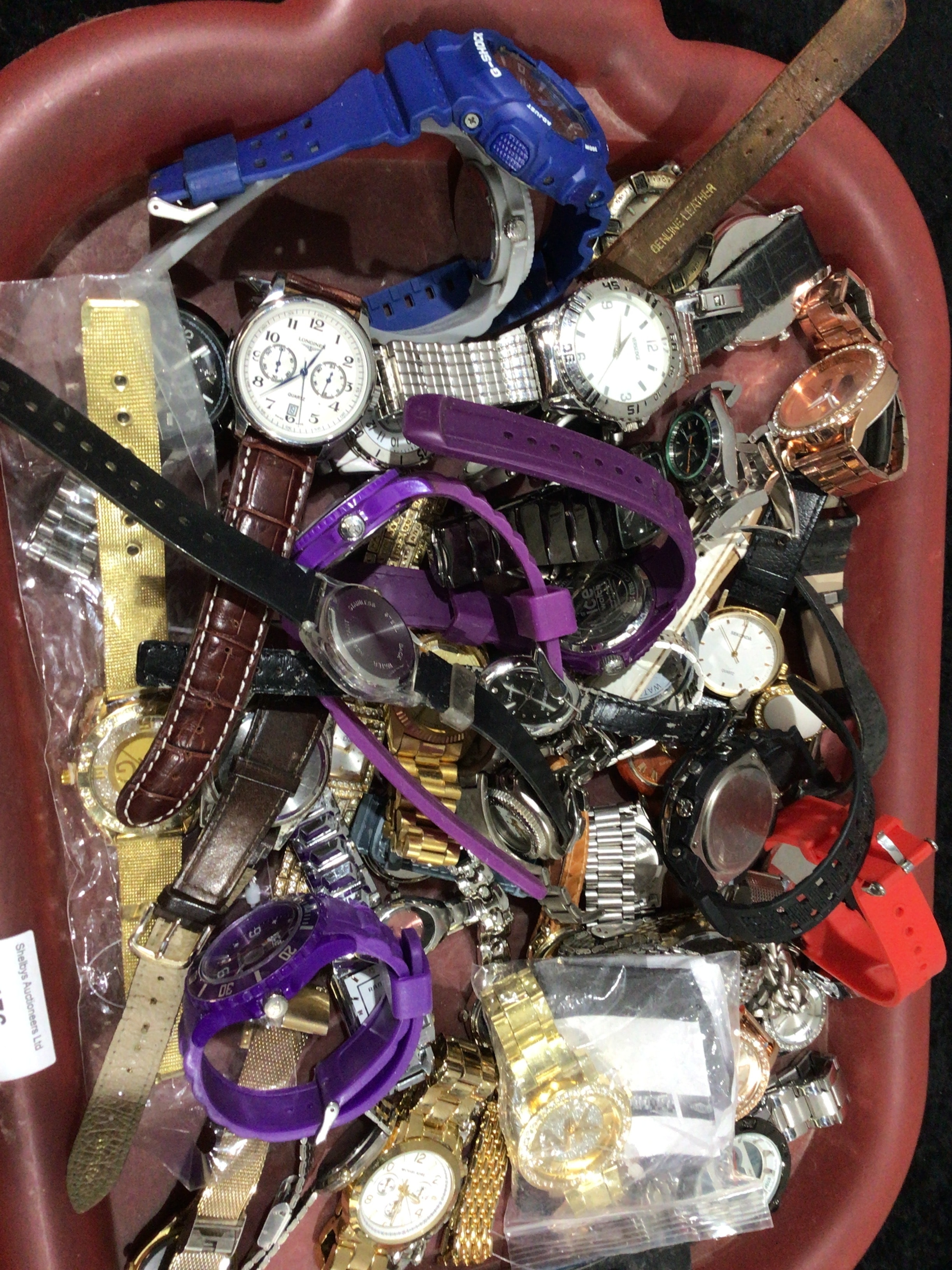 A collection of modern ladies and gents wristwatches, approximately 50 pieces. This diverse lot comprises assorted wristwatches and watch components, predominantly of modern to contemporary styles, likely from the 21st century. The collection features a mix of analog, digital, and chronograph designs. Materials include stainless steel, base metal, plastic/resin, and silicone, with straps of genuine or faux leather. Finishes are presented in silver-tone, gold-tone, rose gold-tone, and various colors such as blue, purple, and red. Visible brand names and markings include G-SHOCK, LONGINES, MICHAEL KORS, GENEVA, ICE WATCH, RAD, QUARTZ, GENUINE LEATHER, STAINLESS STEEL BACK, and WATER RESIST.