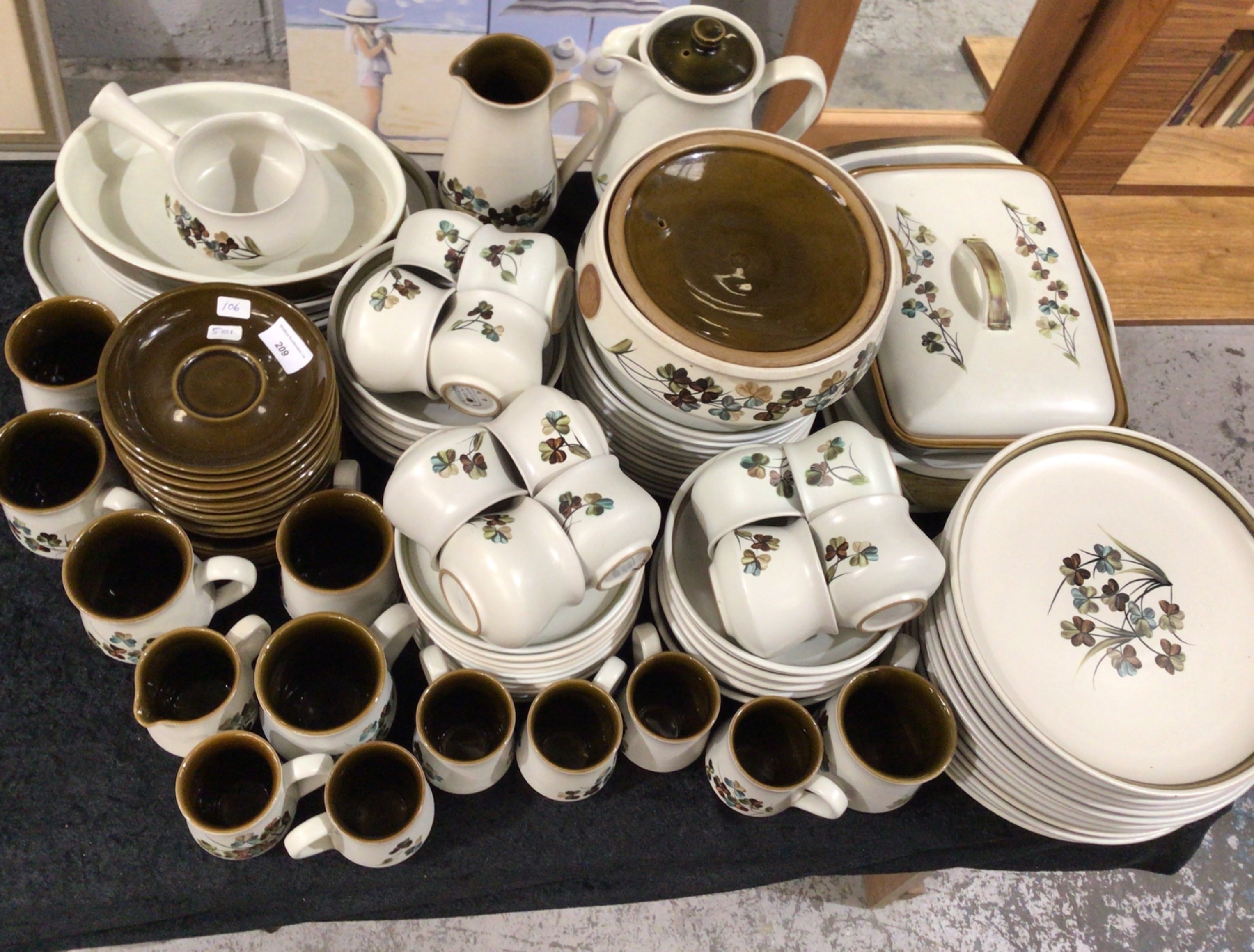 A large collection of Denby ‘Shamrock’ pattern dinner and tea wares, made in England. The comprehensive set comprises cream-colored stoneware pieces, consistently decorated with a repeating green, brown, and blue floral or clover-leaf motif. Many items feature a complementary dark brown glaze on interiors or rims. The collection includes numerous dinner plates, saucers, various bowls, cups, mugs, a lidded teapot, a creamer, a sugar bowl, and a covered rectangular serving dish. A white sticker with “389” is visible on one saucer.