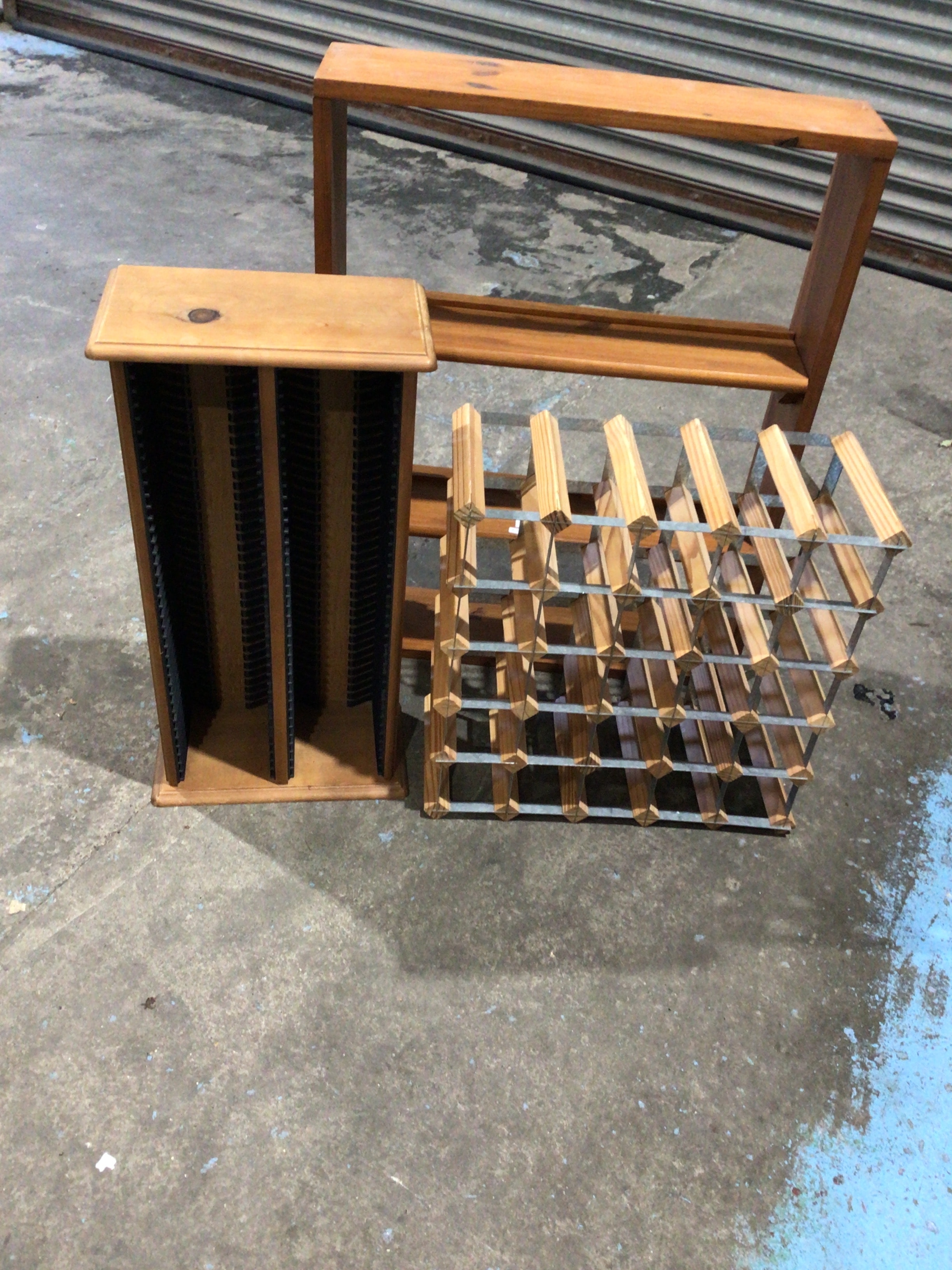 This lot features a group of three contemporary storage units, each crafted primarily from light-toned wood, presenting a distinctly utilitarian aesthetic. The ensemble includes a tall, slender media cabinet fitted with internal black plastic/rubber dividers, an open-frame console or shelving unit, and a modular wine rack further incorporating metal strips. All pieces are designed for functional household use.