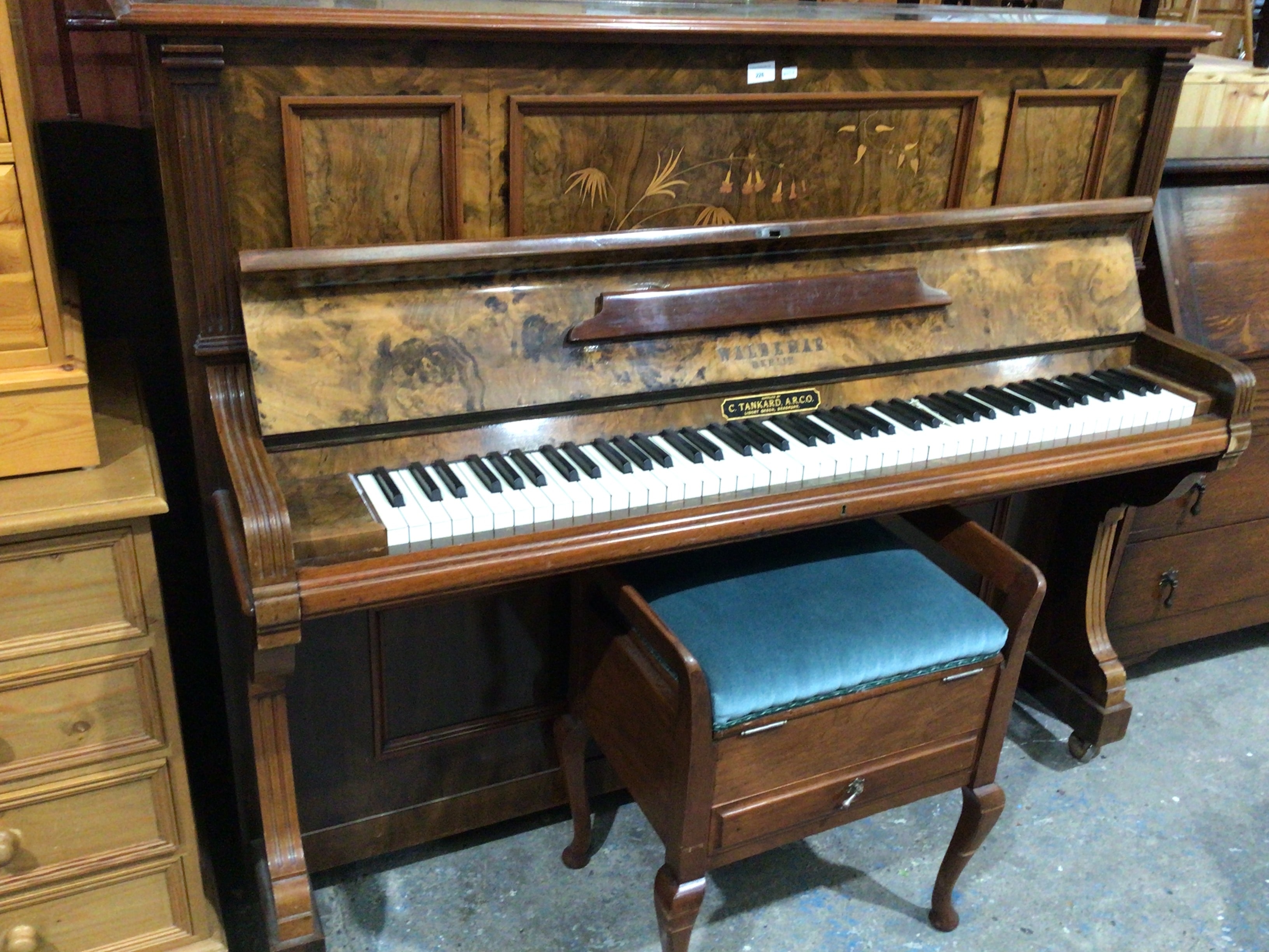 An upright piano by Waldemar, Berlin, constructed primarily from wood featuring a distinctive burr veneer on the fallboard and upper decorative panels, the latter adorned with a light-wood floral inlay or marquetry design. The main body and structural columns are finished in a darker, polished wood. An additional plaque states it was ‘SUPPLIED BY C. TANKARD, A.R.C.O., LIDGET GREEN, BRADFORD.’ The piano presents a full set of black and white keys. Accompanying the piano is a coordinating wooden piano stool with a teal upholstered top.