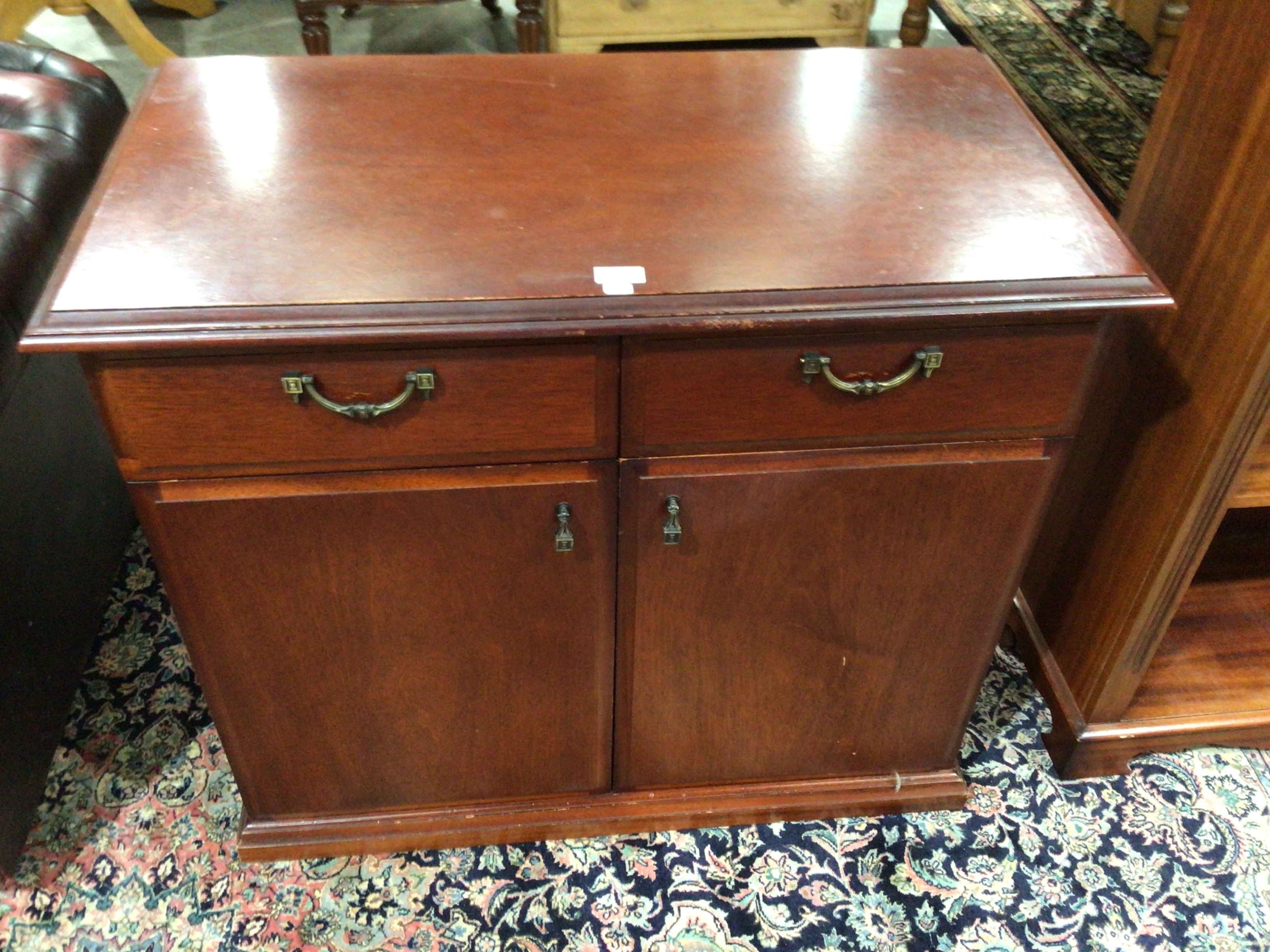 A compact, rectangular wooden cabinet or credenza, finished in a reddish-brown mahogany hue. The piece features a flat top with simple molding, two drawers across the upper section, each fitted with a single brass-toned bail pull. Below, two cabinet doors, each with a small brass-toned key escutcheon, open to reveal an open interior compartment without shelves. The cabinet rests on a shallow plinth base.