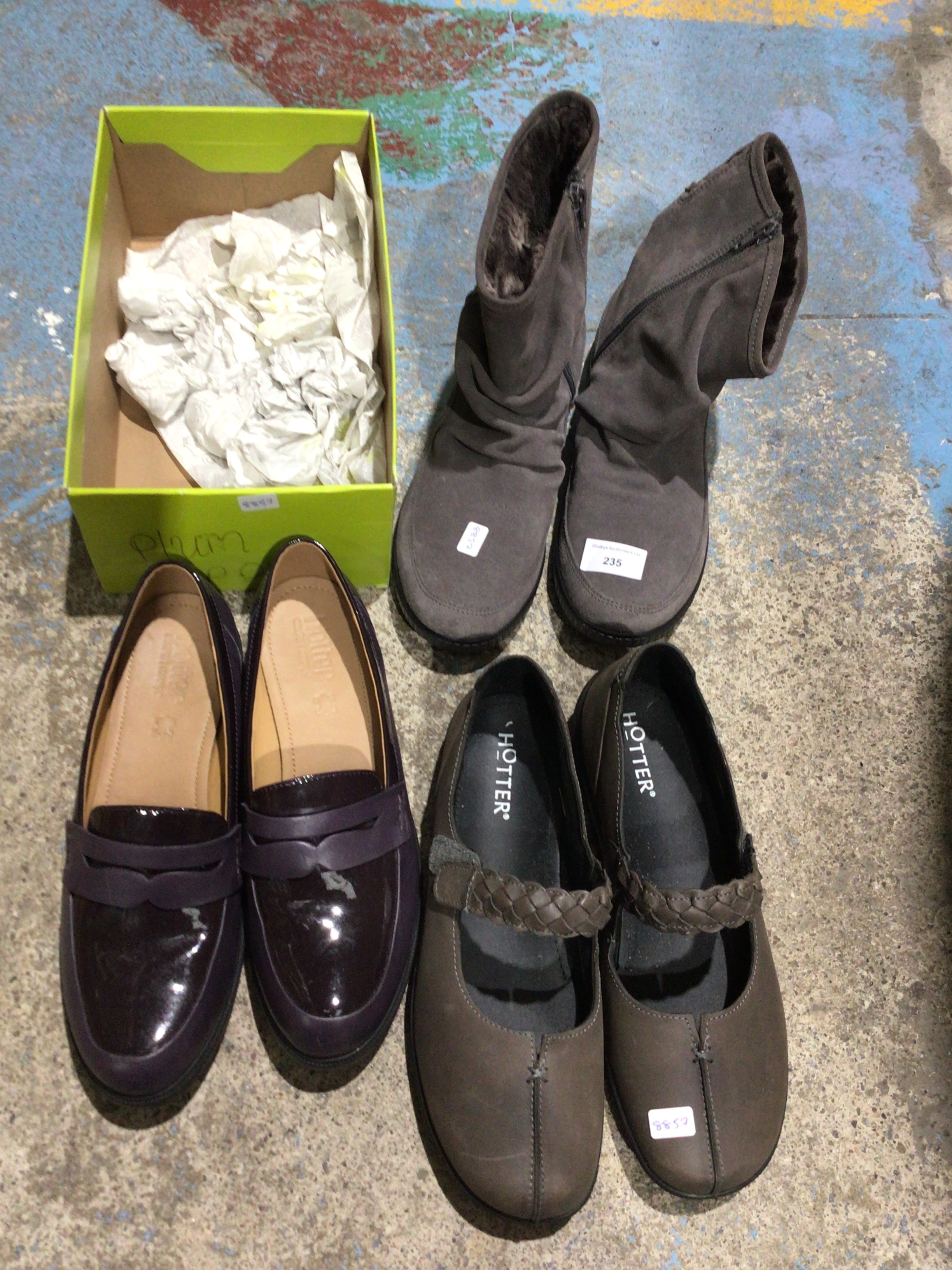 A group of three pairs of women’s footwear. The first pair comprises dark brown nubuck or brushed leather flat shoes in a Mary Jane style with a braided strap across the vamp, prominently branded “HOTTER®” on the insoles, with one shoe marked with a white sticker “8857”, likely corresponding to a women’s US size 8 as emphasized by the user and supported by comparable web listings. The second pair features deep purple patent leather loafer-style flat shoes with a decorative strap across the vamp and an illegible brand stamp on the interior leather insole, with a small sticker bearing “5” inside one shoe. The third pair consists of dark grey suede-like ankle boots with faux fur lining and side zippers, marked with white stickers displaying “235” and “0539” respectively, and one sticker indicating “Shadys Ankle Boots”. Also included is an empty lime green cardboard shoe box, marked with “Plum” in a cursive script and “4444”, containing crumpled white tissue paper.