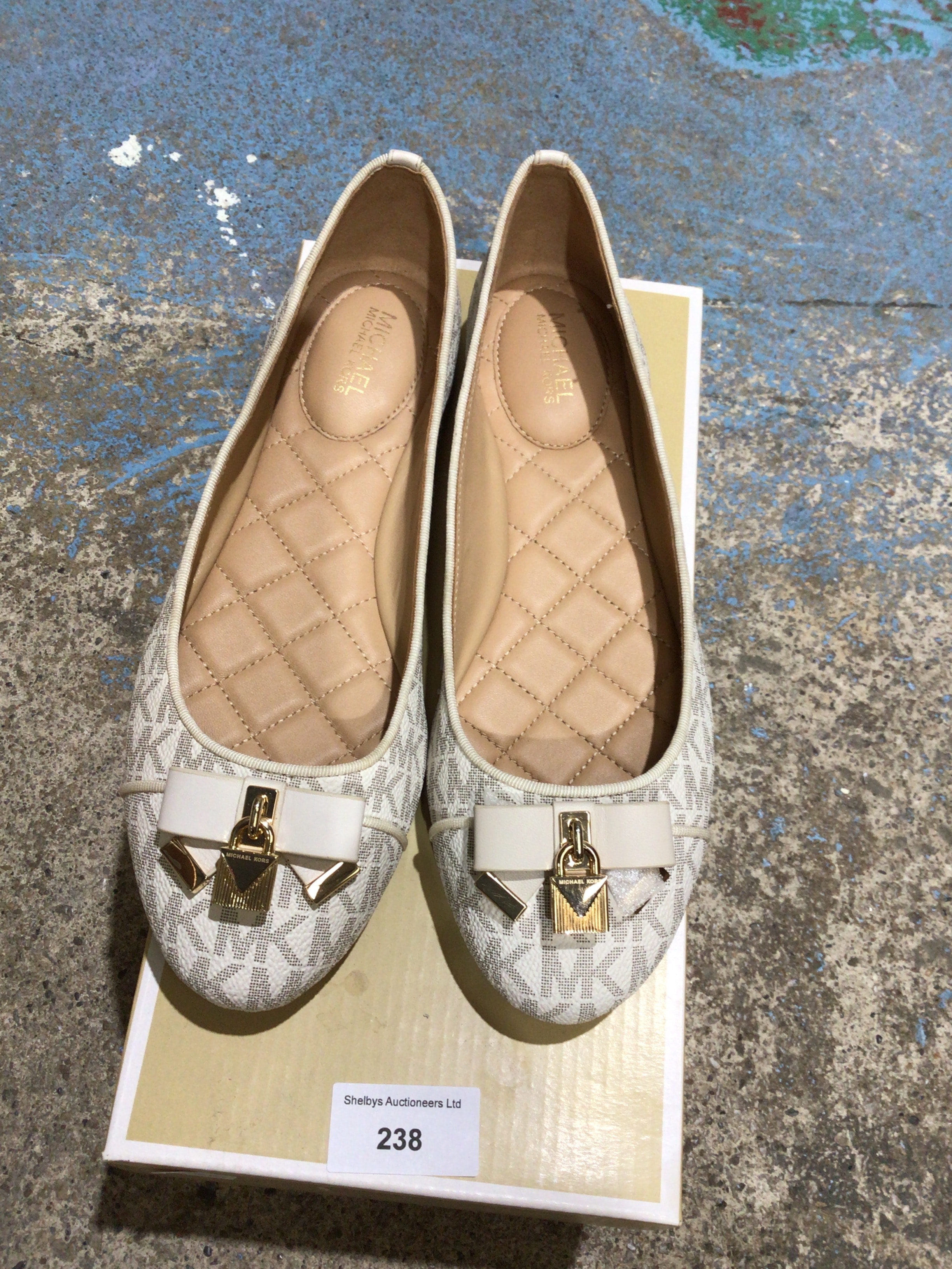 A Pair of Michael Kors Alice Monogram Ballet Flats with Gold-Tone Lock and Bow, Size 5