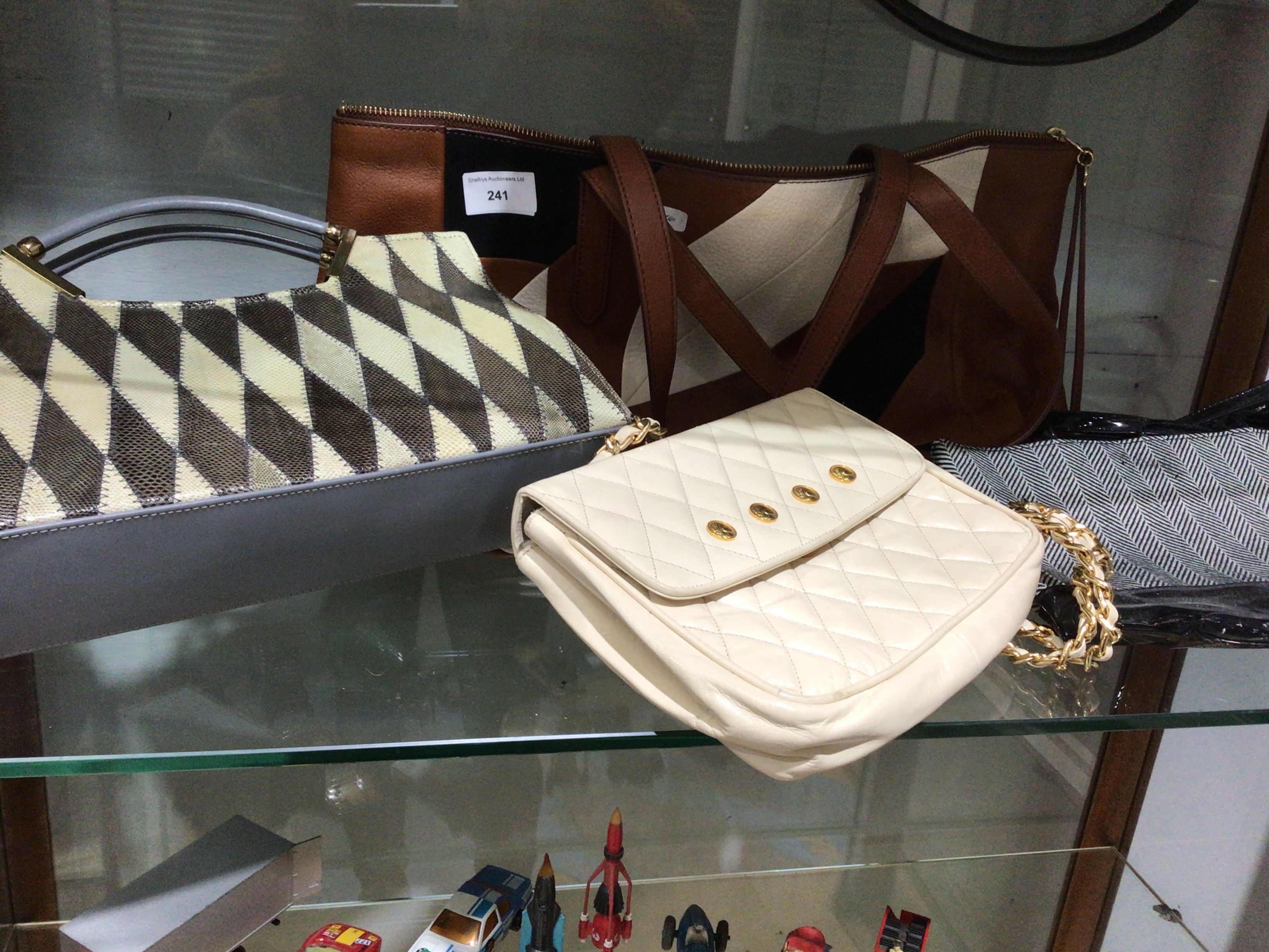 A collection of four contemporary ladies’ handbags. The foreground features a cream-colored, quilted leather or faux-leather shoulder bag with a flap closure secured by four gold-tone circular studs and a matching gold-tone chain strap. To its left is a rectangular bag with a solid grey base and a top section composed of cream and dark brown diamond-patterned panels, likely exotic leather or a realistic embossed alternative, finished with gold-tone hardware. Behind these, a larger tote bag with brown leather handles and trim displays a geometric pattern of cream and dark brown panels and a brass-tone top zipper; this bag bears a white auction label marked “Shelbys Auctioneers Ltd 241.” Partially visible on the far right is a smaller bag or clutch with a black and white herringbone textile pattern.