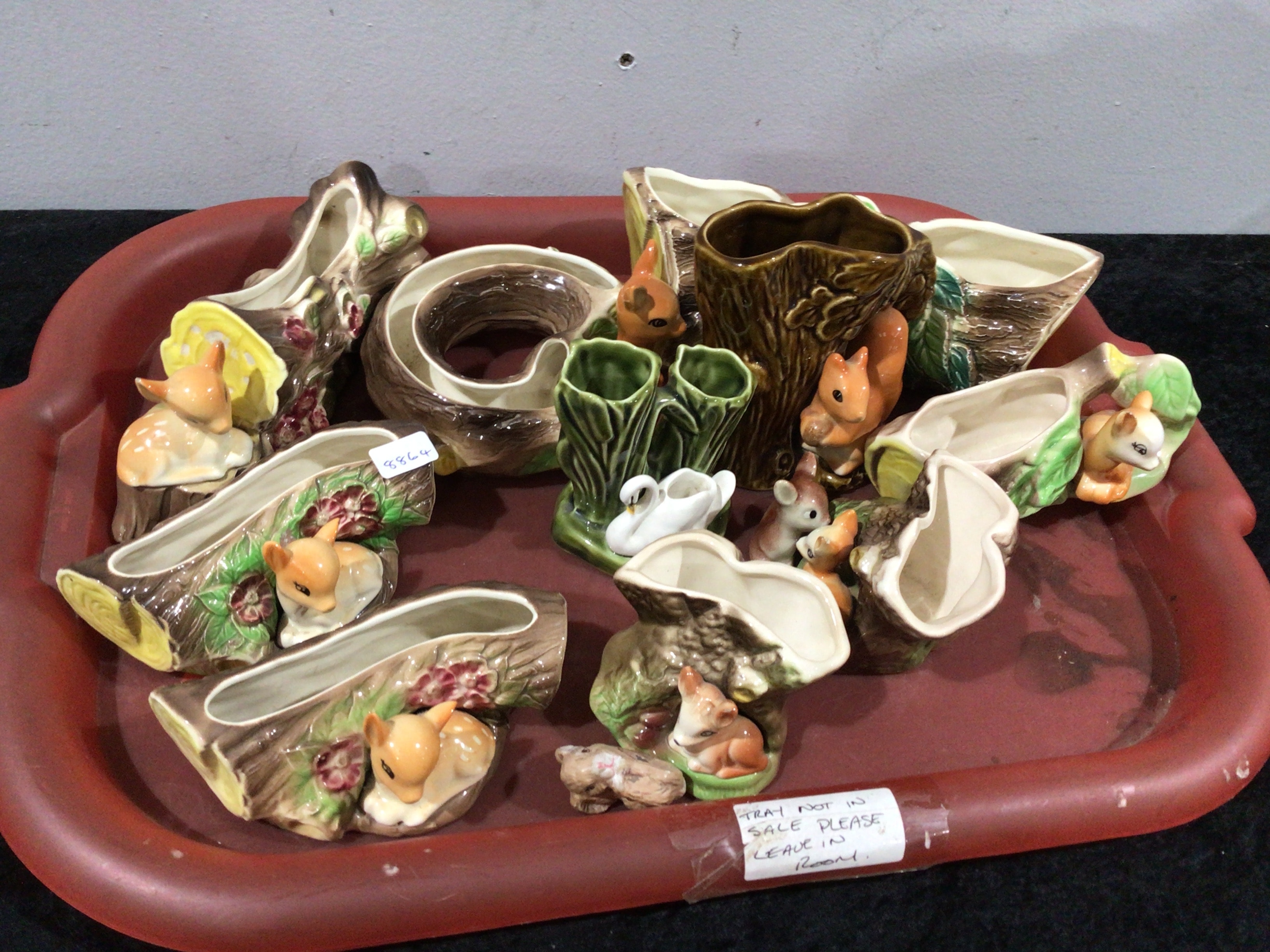 This collection comprises approximately fifteen assorted glazed ceramic decorative objects, predominantly small planters or desk caddies, attributed to Hornsea Pottery. The items uniformly feature a woodland theme, depicting tree stumps, logs, and various small animals such as fawns, squirrels, and a pair of swans. Rendered in a charming, kitschy style indicative of mid-20th-century manufacture, with painted details in browns, greens, yellows, and naturalistic animal tones. One ceramic piece bears a white sticker with the handwritten number “8864.” Please note, the red plastic tray shown in the image is not included in the sale.