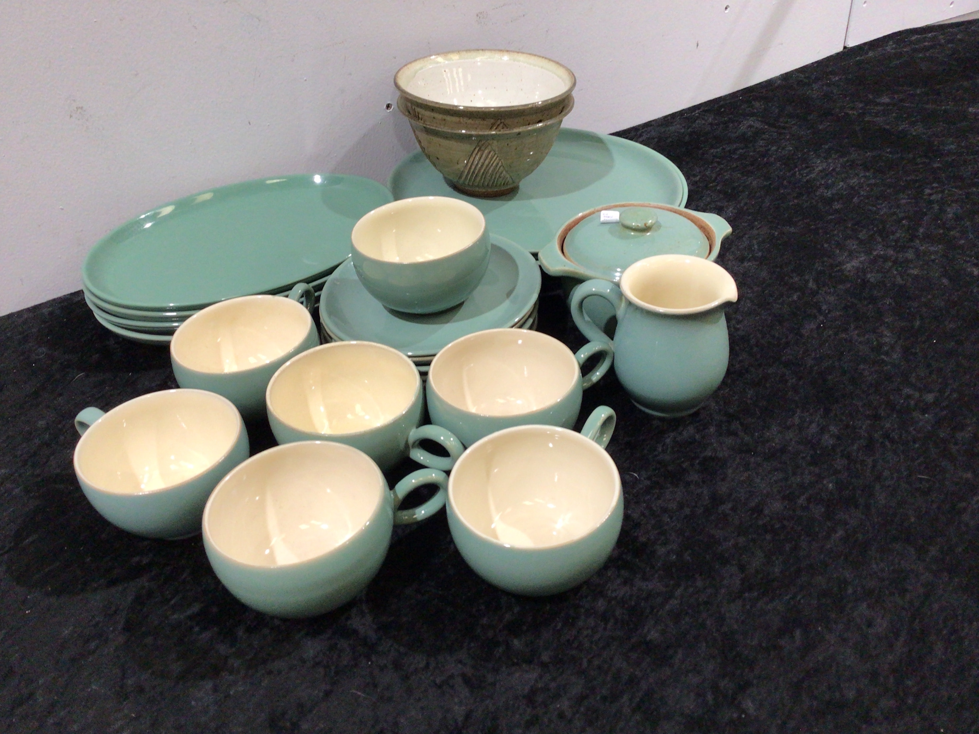 A collection of Denby ‘Manor Green’ glazed ceramic dinnerware, primarily featuring a glossy aqua/light teal green exterior with creamy off-white interiors, consistent with a mid-20th century aesthetic. The ensemble includes a set of cups, a group of small plates or saucers, a group of oval serving platters, a lidded serving dish, and a pitcher or creamer. Complementing these are two bowls with an earthy green exterior, brown rims, creamy interiors, and distinctive impressed linear patterns, indicating a possible artisan origin that aligns with the set’s color palette. No discernible text or manufacturer markings are visible, beyond an unreadable sticker on the lidded dish.