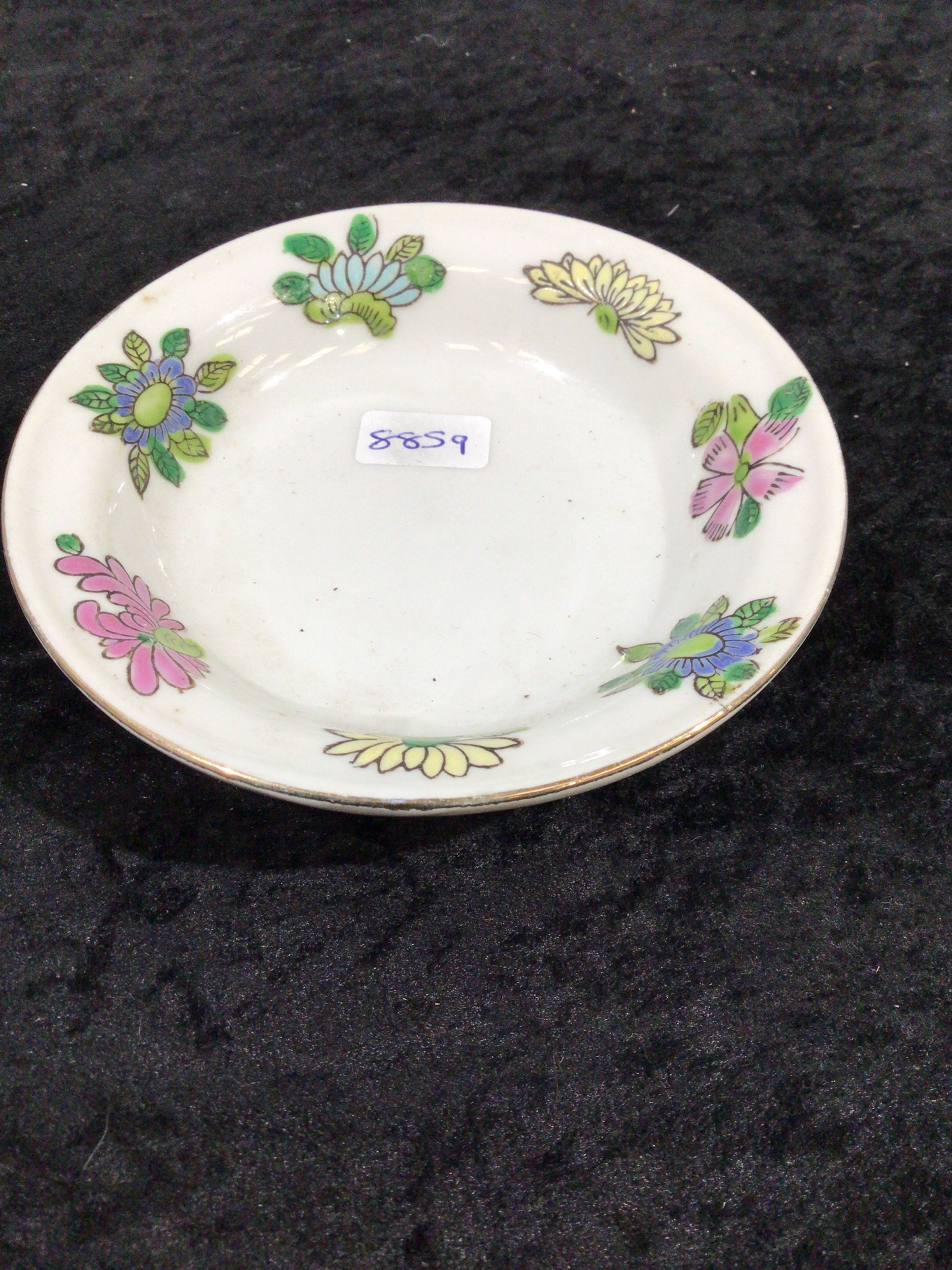 This small, round porcelain dish features a shallow, concave form. It is decorated on a white ground with stylized floral motifs in pink, purple, green, light blue, and yellow around both the interior and exterior rims. A thin gilt band accents the top edge. The unglazed footrim on the base displays a red square seal mark, which translates to “Made in the Qianlong Reign” (乾隆年製). A white sticker bearing the handwritten number “8859” is present on the interior. The overall aesthetic suggests a traditional Chinese ceramic style.
