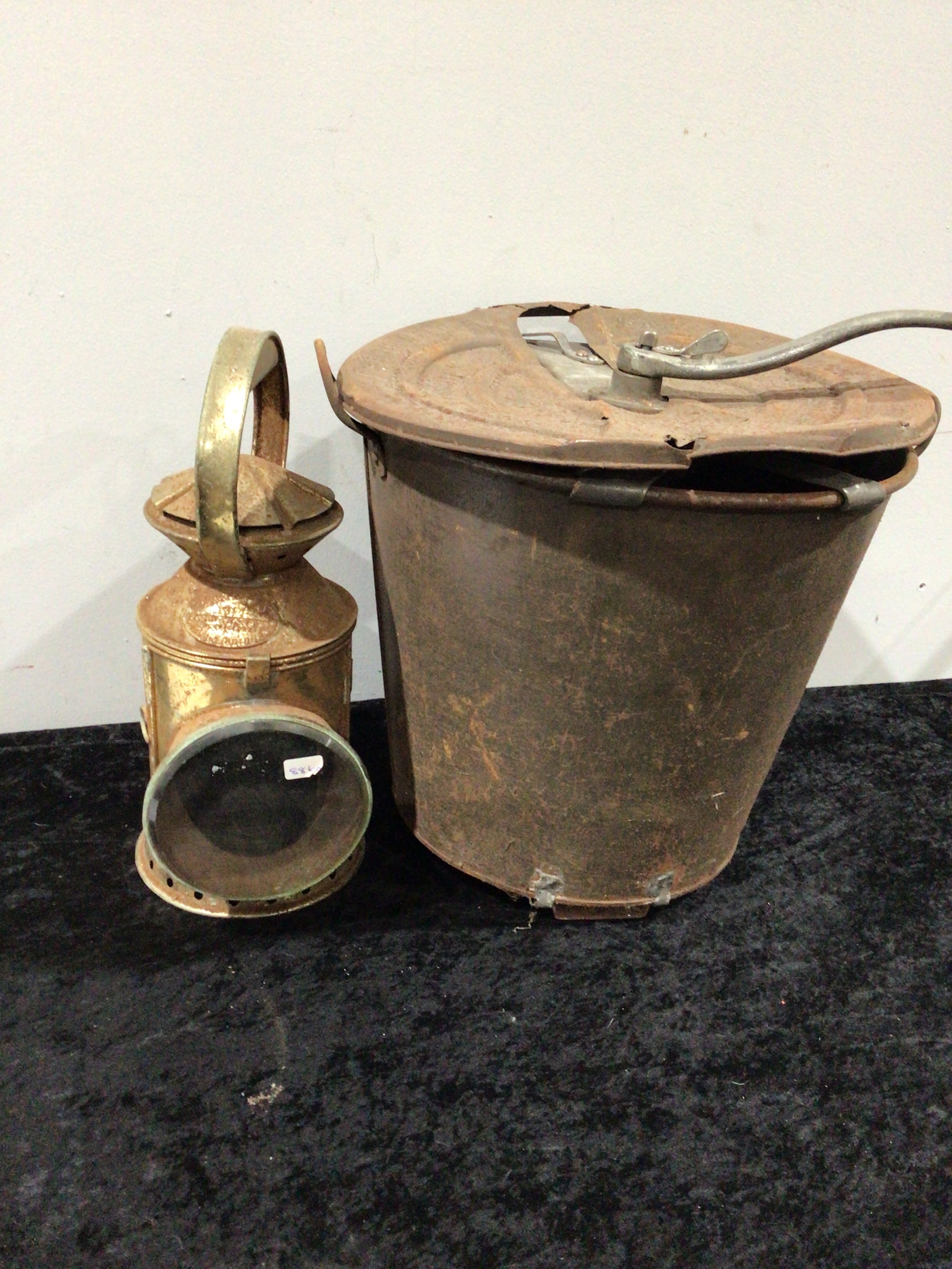 A Landers, Frary & Clark Universal No. 8 Bread Maker, a cylindrical, lidded iron or steel vessel, equipped with a hinged lid and wire bail handle. The vessel is embossed with an oval marking identifying it as a “NO. 8 THREE-MINUTE BREAD MAKER” by “LANDERS, FRARY & CLARK, NEW BRITAIN, CONN. U.S.A.”, and notes it was “AWARDED GOLD MEDAL ST. LOUIS EXPOSITION 1904”. This is accompanied by a brass-toned metal lantern, featuring a top handle and a prominent front opening. The lantern bears an oval plaque reading “PRENTICE”, “1917”, and “SOUTHERN MANUFRS LTD BIRMINGHAM”.