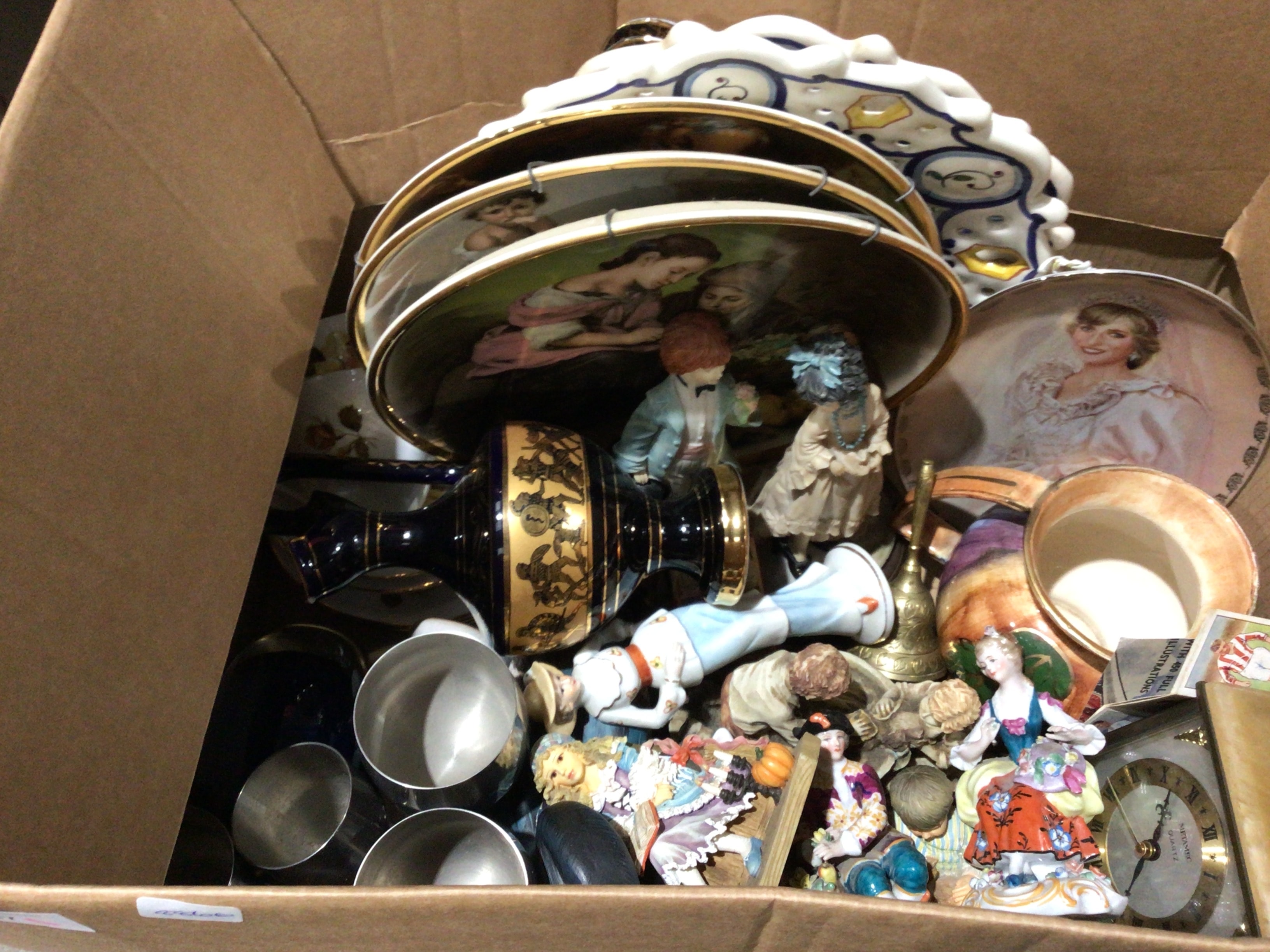 A diverse collection of decorative items, primarily featuring ceramic and porcelain pieces. This lot includes a group of display plates with gold-toned rims, some depicting classical or cherubic scenes, alongside a commemorative plate featuring Princess Diana, Princess of Wales. Other items comprise a dark blue vase with gold-toned classical figure relief, a group of porcelain figurines in varying styles, some rococo-inspired with pastel colors, and a brass-toned bell. Also present are multiple silver-toned metal cups, a small clock with a Roman numeral face marked ‘QUARTZ, ‘ and a partial view of a book titled ‘WITH 450 FULL ILLUSTRATIONS.’