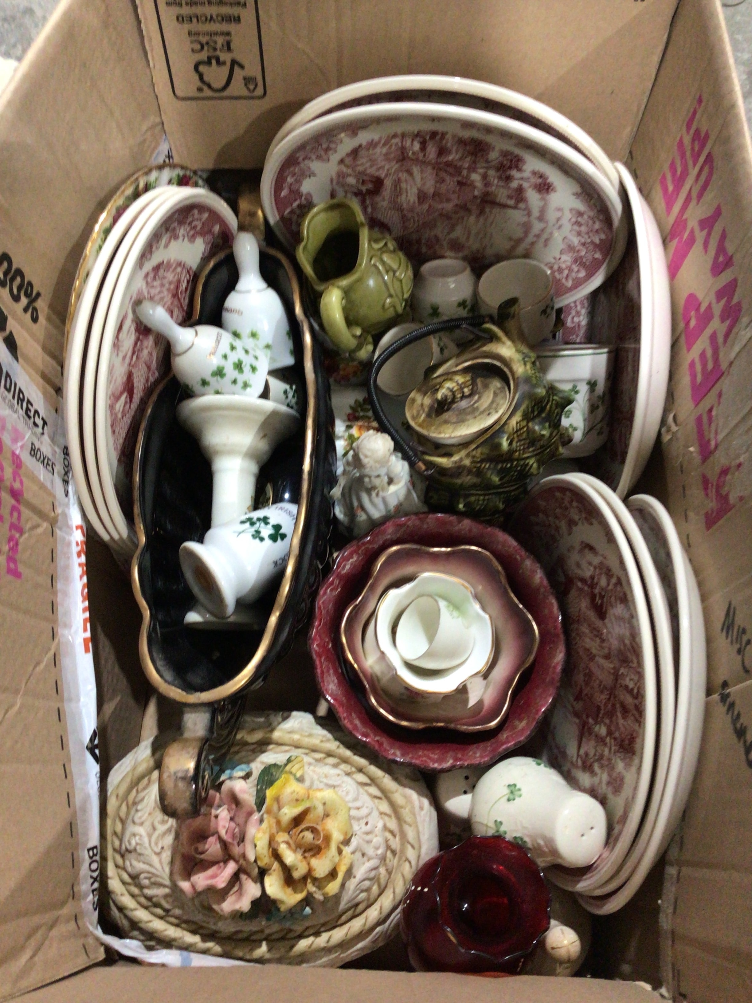 A collection of ceramic tableware and decorative items. The group includes a dark green textured teapot and a green ceramic creamer/pitcher, both in the Capodimonte style with raised floral motifs. Also present are a beige decorative object with raised floral (rose) motifs, consistent with Capodimonte style. The collection features several white plates with a red/burgundy transferware pattern, depicting pastoral or scenic designs, some retaining gold rims. Further items include multiple white ceramic pieces adorned with green shamrocks, such as salt shakers and small cups. A black ceramic tray with gold trim, a set of stacked wavy-edged red and white bowls with gold accents, and a red glass or ceramic rose are also part of the collection.