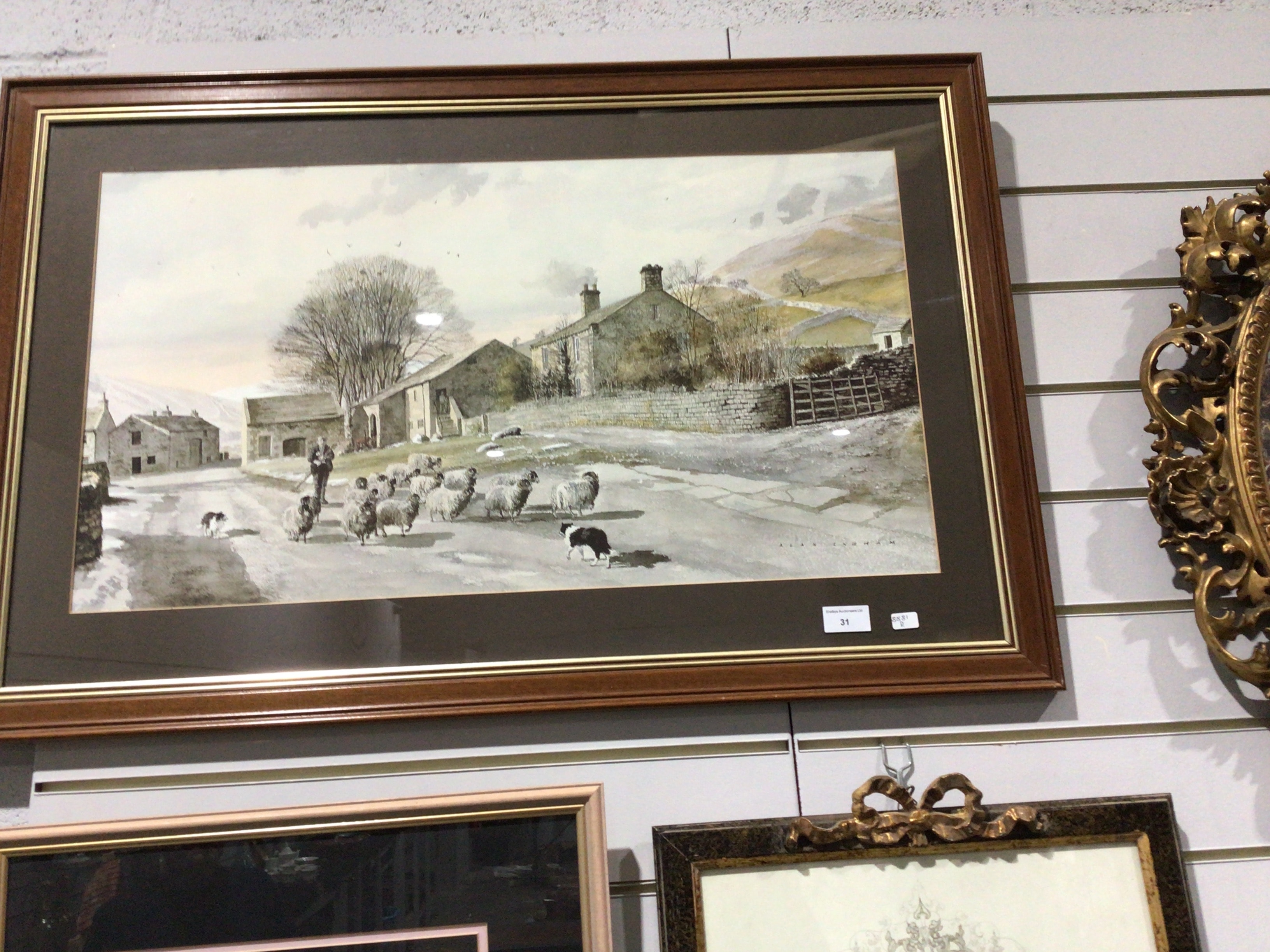 An Alan Ingham (1932-2002) framed and glazed print, titled ‘Down From The Hills’. The artwork depicts a realistic pastoral landscape scene featuring a shepherd with sheep and sheepdogs on a dirt road, set against traditional stone buildings and hills under a cloudy sky. The print is presented within a medium-brown wooden frame, complemented by a gold-colored inner liner and a dark mat board. The mat is signed ‘ALAN INGHAM’ below the image. An auction house label from ‘Shebys Auctioneers Ltd’ with lot number ’31’ is affixed to the lower right corner.