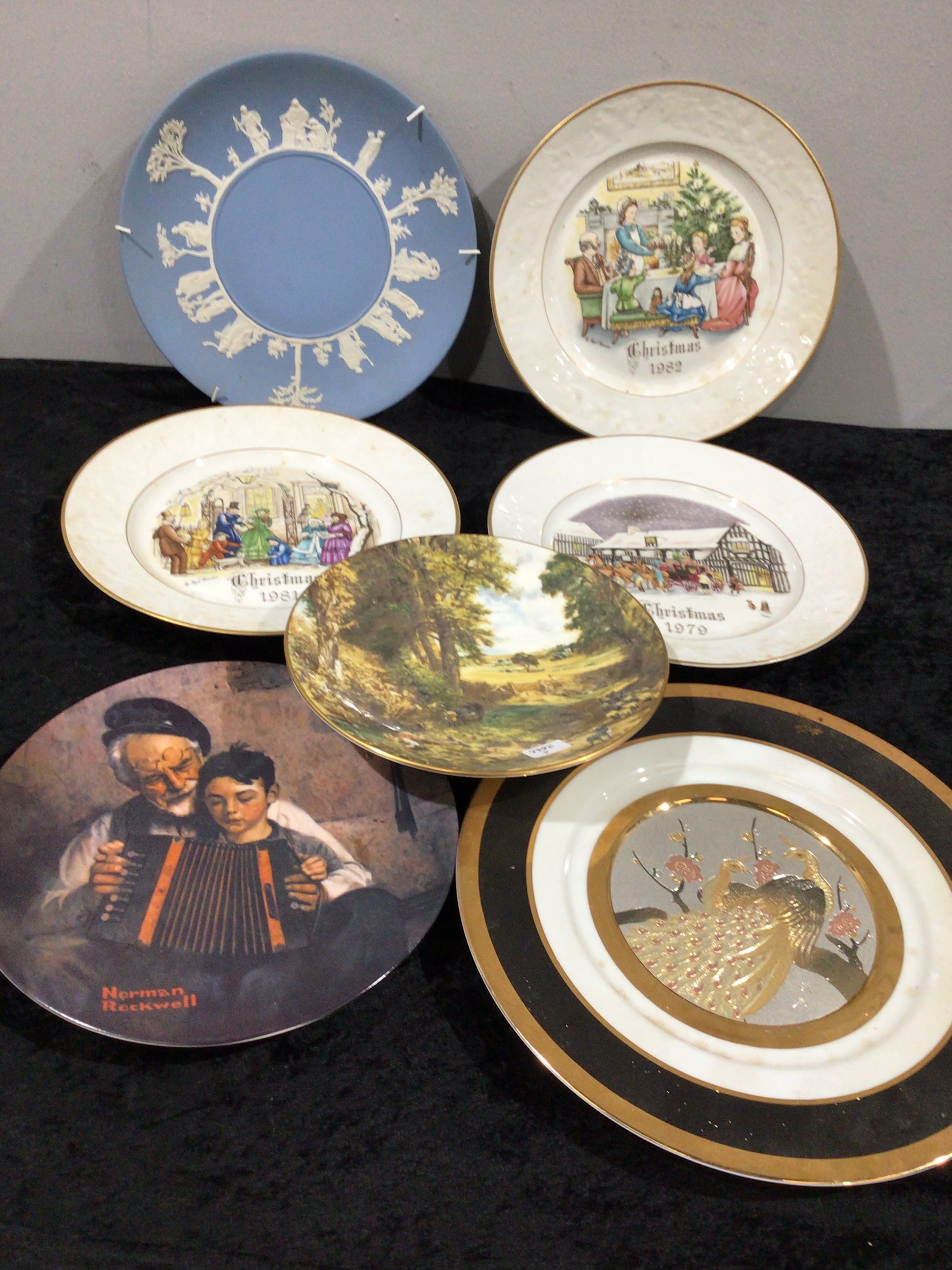 A collection of seven decorative plates. This lot includes three white porcelain plates featuring polychrome festive or historical Christmas scenes, marked “Christmas 1982,” “Christmas 1981,” and “Christmas 1979,” consistent with late 20th-century collectible issues by Coalport. Also present is one light blue ceramic plate, resembling jasperware, with white bas-relief classical figures and foliage around the rim. Another plate displays a traditional polychrome landscape painting, likely a transfer print. A sixth plate presents a polychrome illustration of an elderly man and a young boy playing an accordion, signed “Norman Rockwell.” The seventh plate is white with a prominent black and gold rim, enclosing a central design of two stylized peacocks and blossoming branches in metallic gold and muted colors, suggesting an Art Deco or East Asian influence.