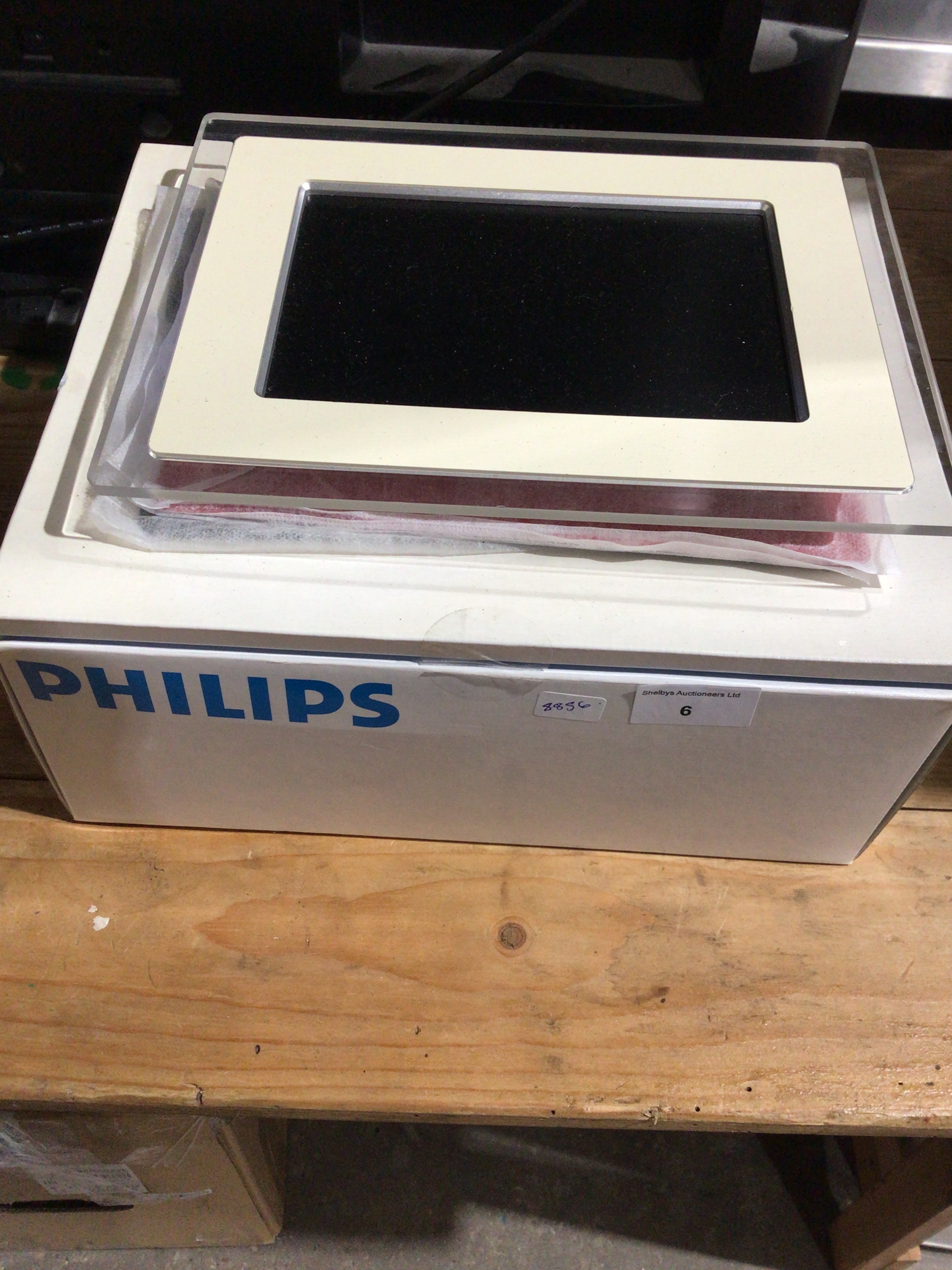 A Philips 9 Inch Digital Photo Frame, Model 9FF2. The device features a black screen set within an off-white/beige bezel and is encased in a clear acrylic or plastic frame. It rests on its original white cardboard packaging box, which prominently displays the ‘PHILIPS’ brand name in blue text. The box also includes auction house stickers for ‘Shebys Auctioneers Ltd’ with lot number ‘6’ and an inventory number ‘8856’.