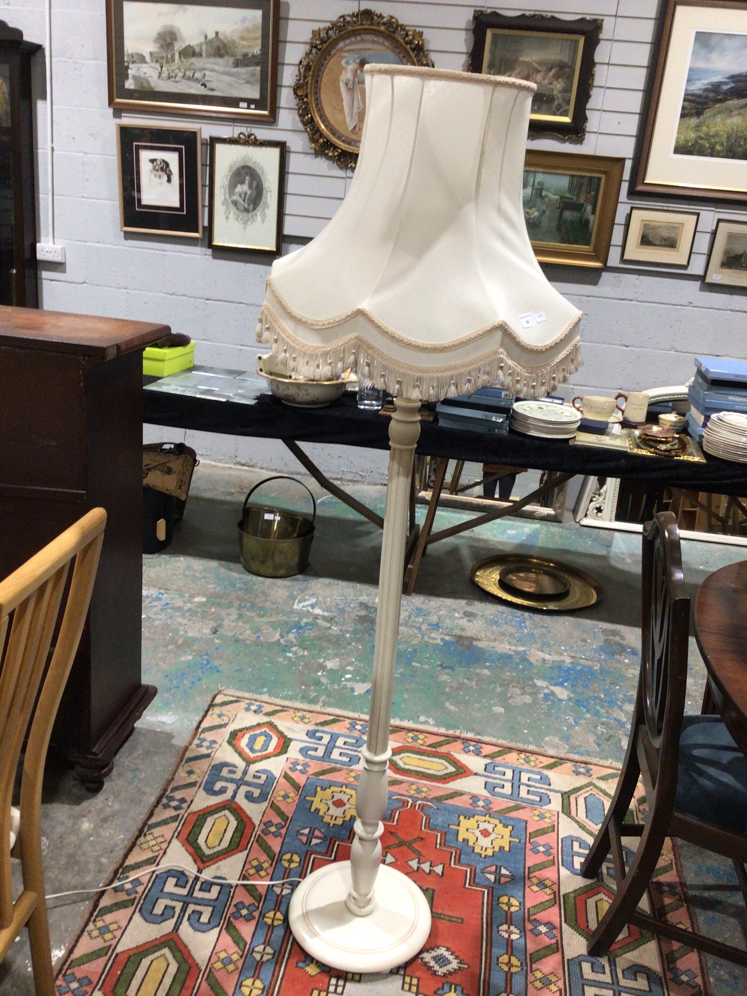 A vintage standard floor lamp featuring a cream or off-white pleated fabric lampshade. The lampshade is of bell shape with a scalloped lower edge, adorned with a decorative fringe and braided trim. Two handwritten numerical markings, “16” and “16”, are visible on the lampshade. The lamp’s stem and circular pedestal base are crafted from turned wood, painted in a light, possibly cream or pale grey, color. The wooden elements exhibit fluted and baluster-style decorative turning.
