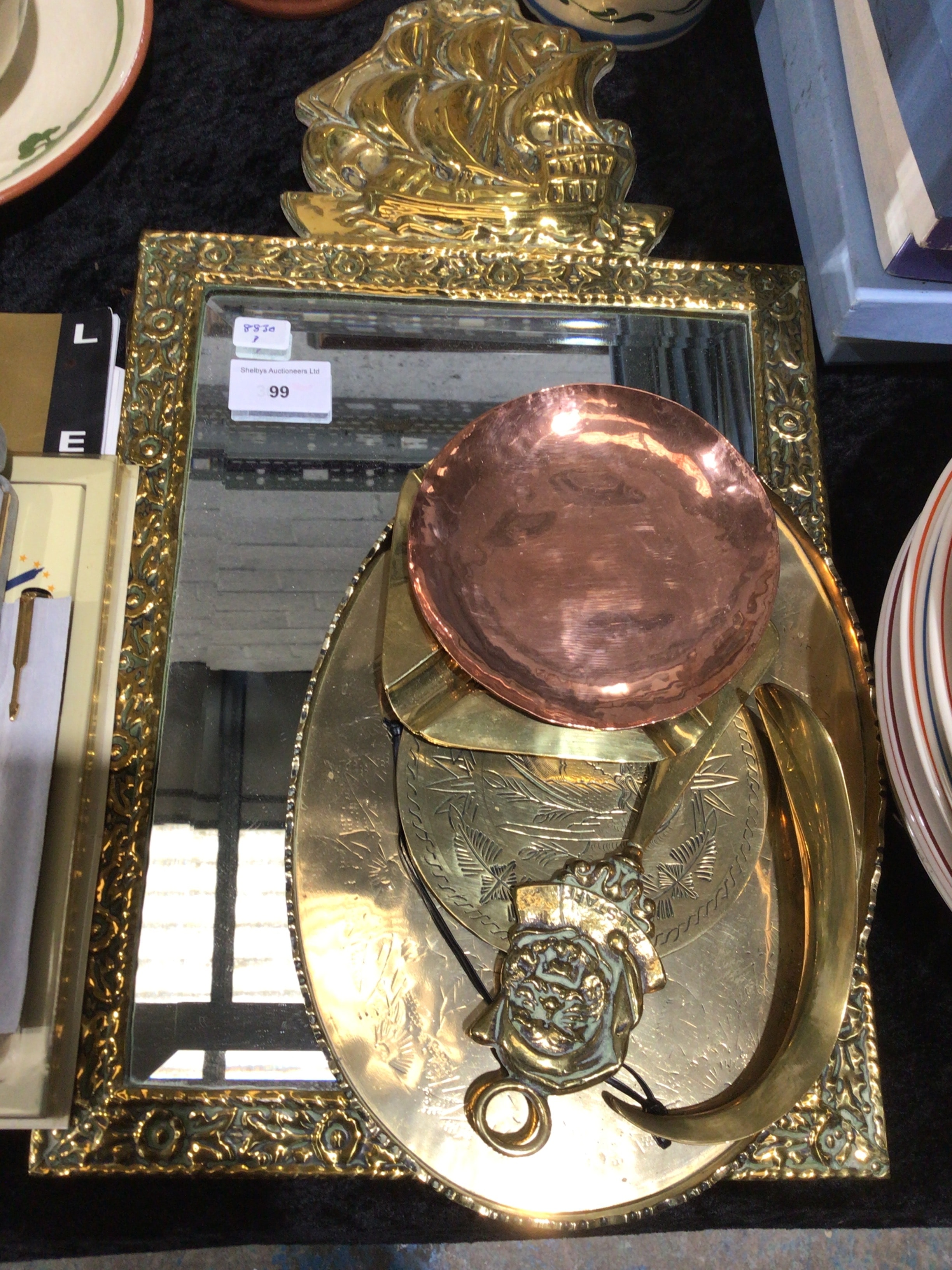 This lot comprises an assemblage of decorative metalware displayed on a rectangular mirror with an ornate gilt metal frame. The metalware includes a substantial brass galleon ship ornament, a large oval brass tray engraved with foliate designs, a smaller hammered copper dish, and a brass decorative object, possibly a crest or badge, partially inscribed ‘…STAFF’ and featuring a ring and hook, resting on the oval tray.