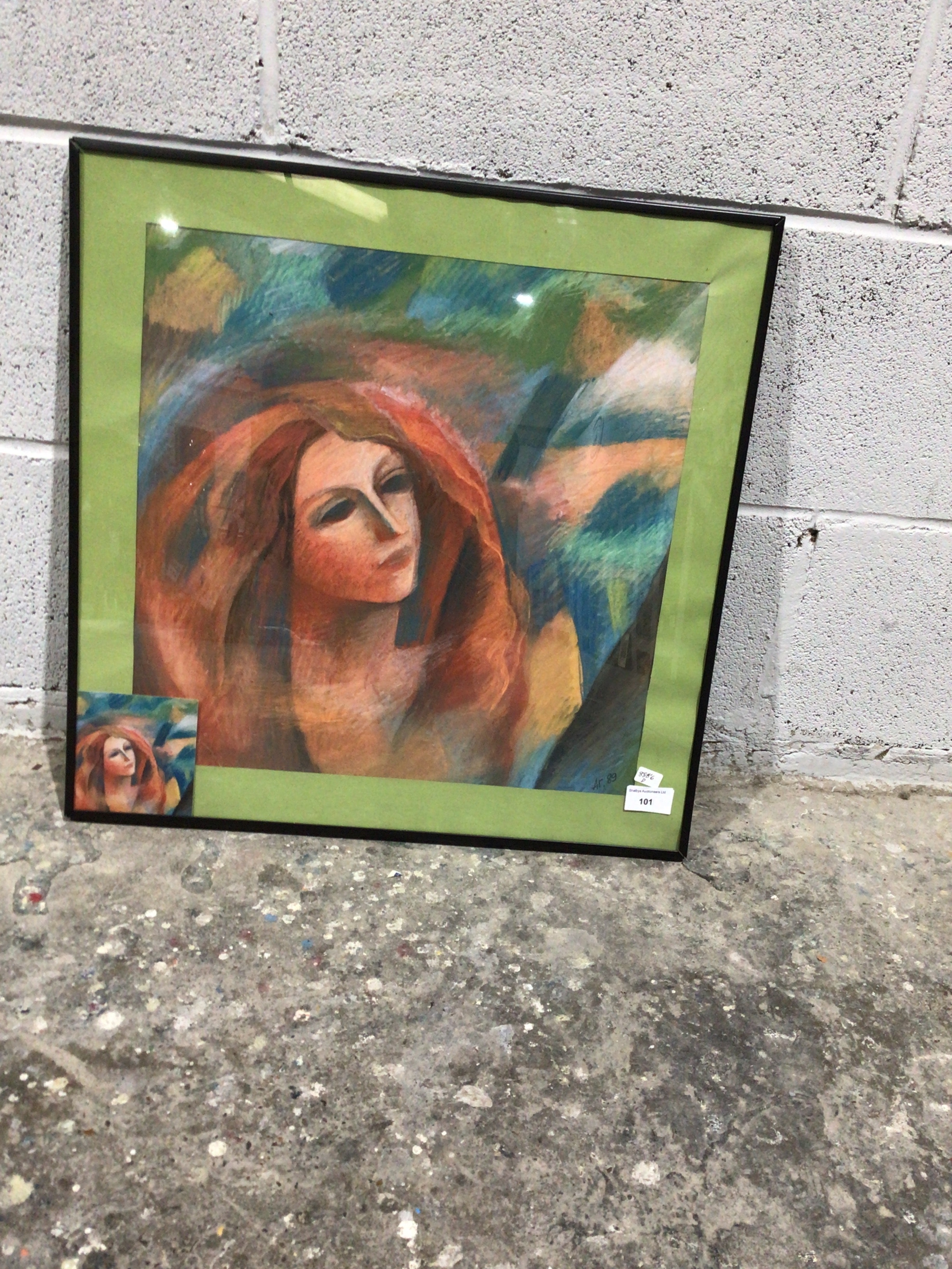 A framed Late 20th Century figurative pastel drawing, signed ‘Ar. 89’ in the lower right corner. The artwork depicts a woman with flowing reddish-orange hair and a serene expression, rendered in an expressive style with vibrant blues, greens, oranges, and reds. Executed in pastel or chalk on paper. Presented under glass, with a light green mat, within a simple black frame.
